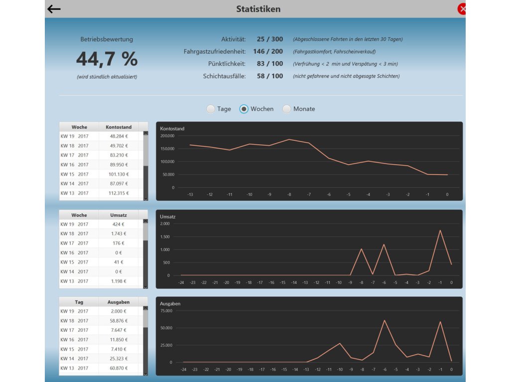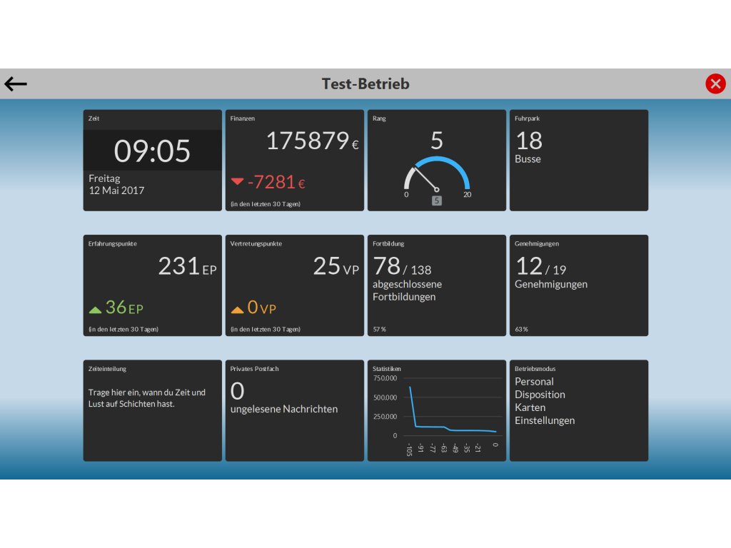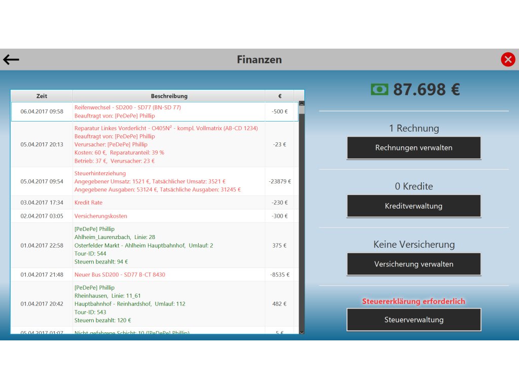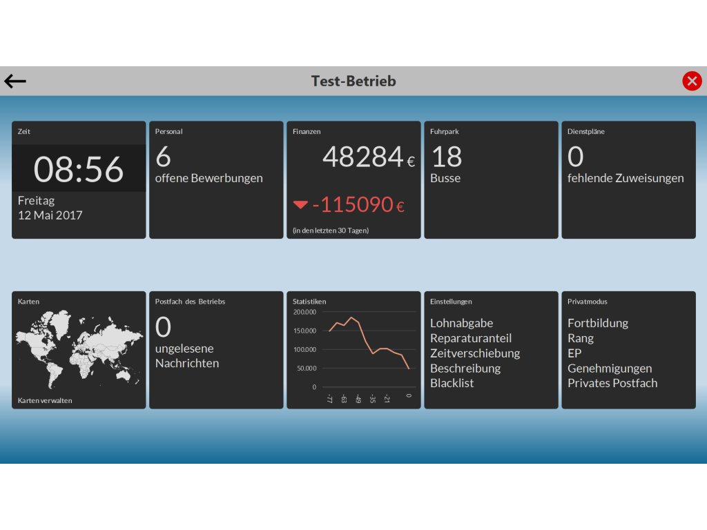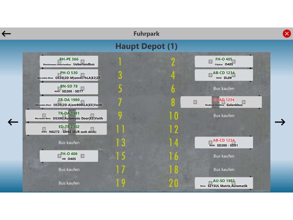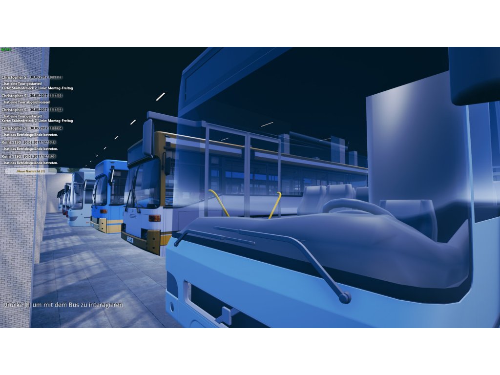 The player can join an existing bus company online, meet his colleagues at the 3D depot, chat with them, carry out inspections, organise shift schedules, and much more. After he has accumulated a bit of money and experience, the player can found his own company online, hire employees, buy more route licences, expand the bus depot, and thereby build up his own bus empire. In the single player mode, the player can even start with his own company right away.