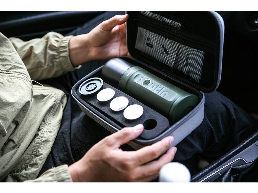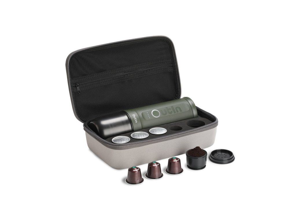 Outin Nano Cestovná sada - prenosný kávovar (lesná zelená) + ochranné puzdro