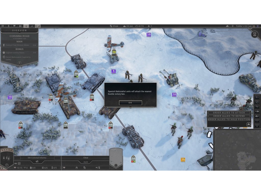 JOIN FORCES WITH SPAIN: Expect to fight side by side with your Spanish allies, in the first Panzer Corps 2 campaign to feature a dedicated AI controlled friendly faction.For those concerned about the AI, there are powerful new tools at your disposal to help guide and give orders to your AI partners to ensure their performanceon the battlefield is decisive and effective.And prepare for the dramatic conclusion of the Spanish Civil War that will feature the very first multi-sided, 3 way conflict present in a Panzer Corps 2 campaign scenario.