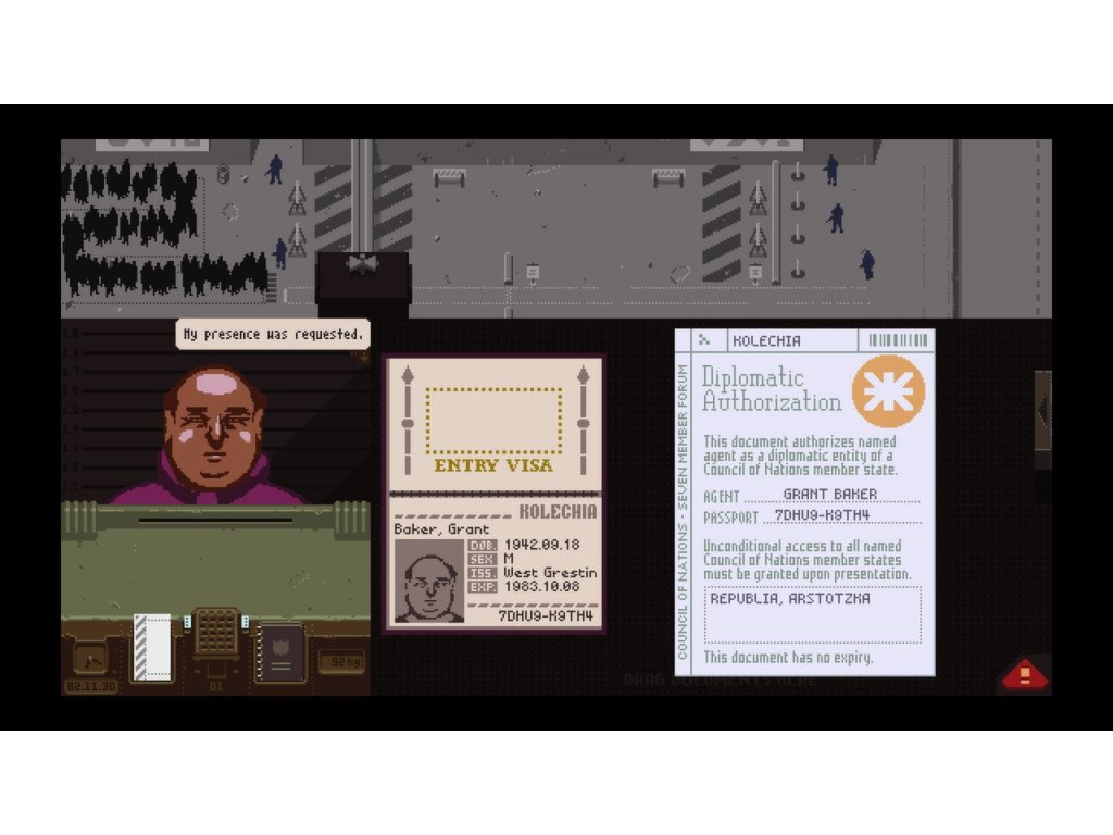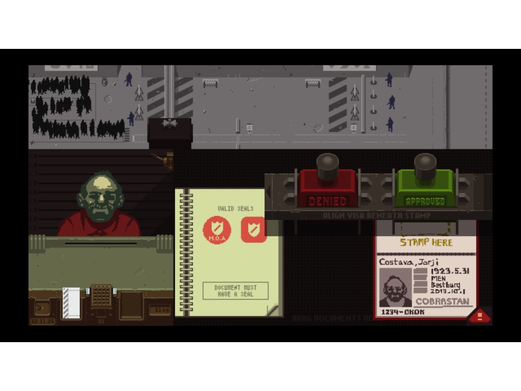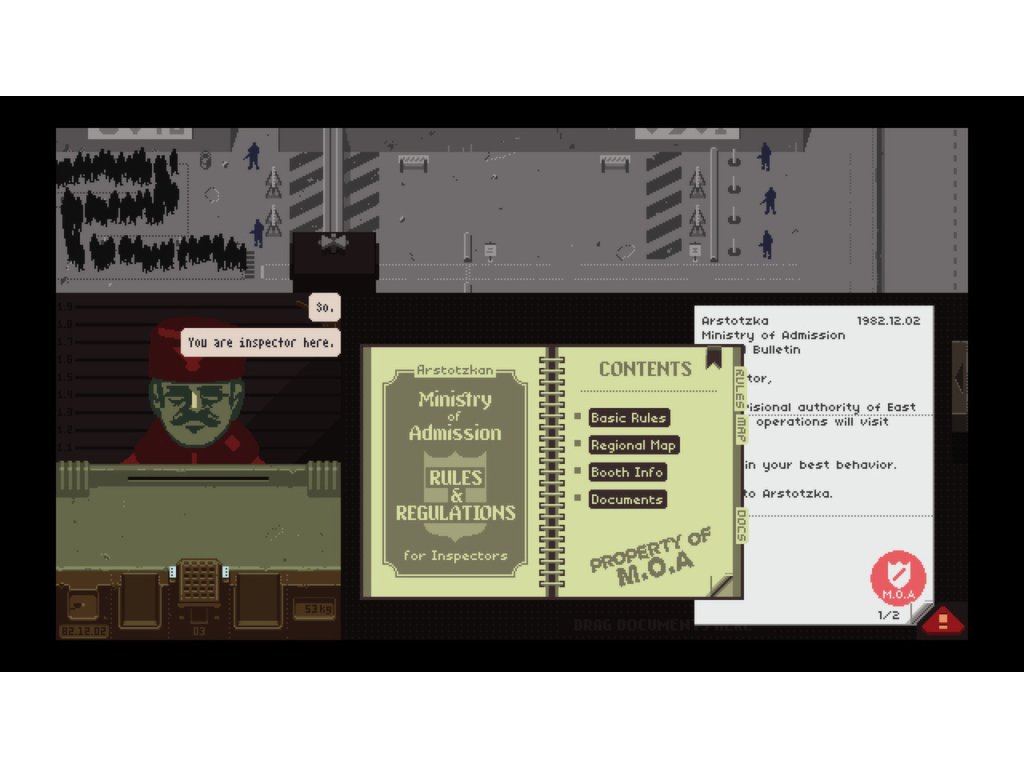 The player's task as the border inspector in the Grestin border checkpoint is to inspect and check the immigrants coming from Kolechia and wishing to enter the country of Arstotzka. You have been chosen to this job via a lottery. The job may seem to be boring, but it's also very demanding as the people who come to your checkpoint may sometimes be a dangerous criminals, terrorists, smugglers, and thieves. You need to carefully check every possible aspect before letting someone through the border.