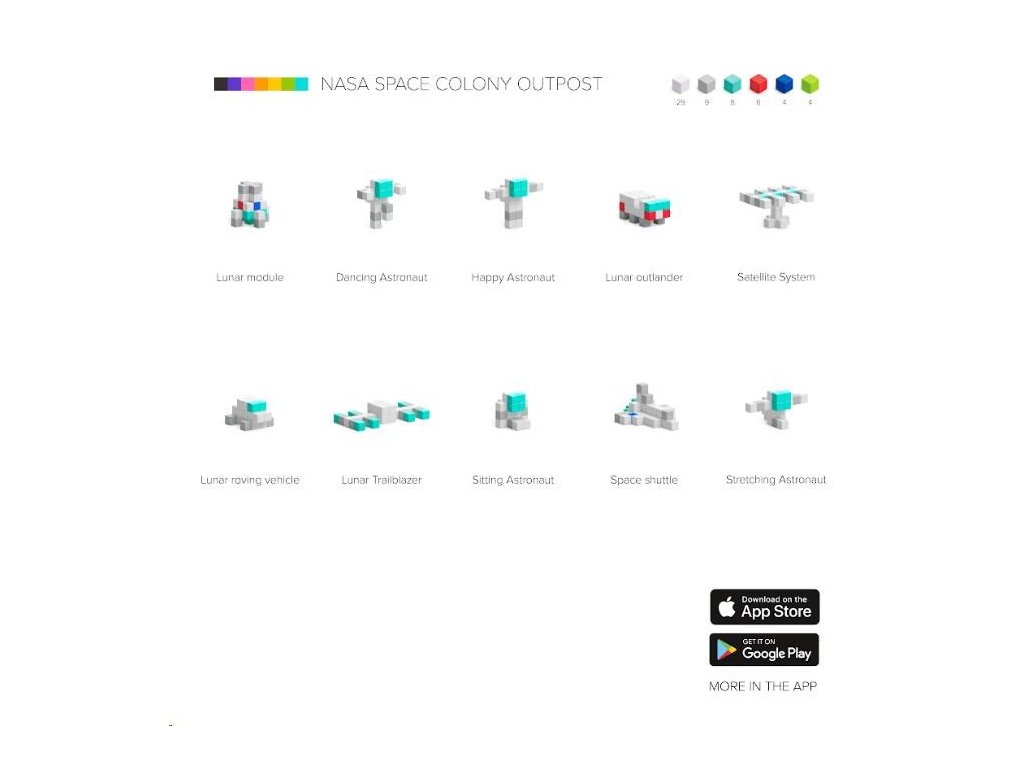 Stavebnica PIXIO 31102 NASA Space Colony Outpost (Koloniálna základňa) obsahuje 60 kociek PIXIO v 5 farbách. Umožnia oživiť vaše kreatívne nápady a prinesú farebnú radosť do života. Začnite stavbou jednoduchých modelov podľa pokynov a potom, až budete pripravení, prejdite k vytváraniu vlastných návrhov. S touto sadou si môžete postaviť astronautov, raketoplán, lunárny modul, lunárne vozidlo, satelitný systém, rover a mnoho ďalších. Pixio je splnený sen fanúšikov Pixel Artu, hráčov Minecraftu a všetkých, ktorí sa radi hrajú. Použite ho ako učebný zdroj na rozvoj detskej kreativity. Obsahuje 5 farieb, ktoré vám pomôžu premeniť jednoduché tvary na skvelé objekty a postavy (biela 29x, sivá 9x, svetlomodrá 8x, červená 6x, modrá 4x, svetlozelená 1x).