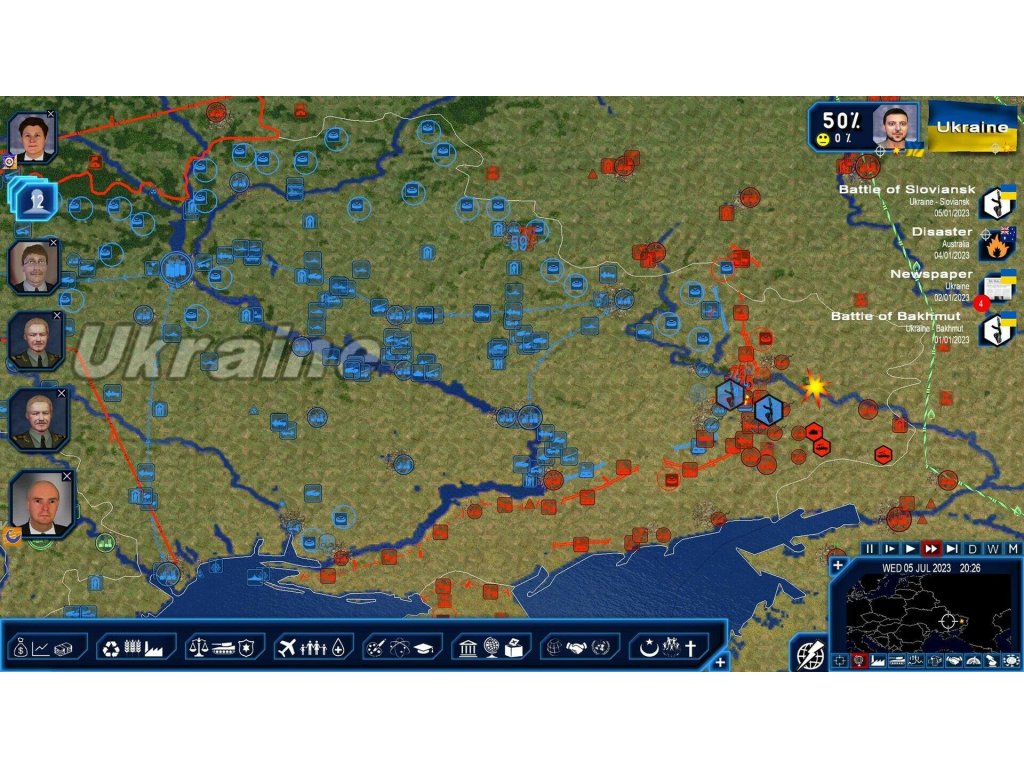 The "Ukrainian Counteroffensive" scenario allows you to play as the Ukraine just as they launch their attack with up to date data: front lines, troop strength, detailed weaponry, especially those promised by Western powers... Your objective is to recover as much of your territory as you can to be able to negotiate peace accords from a position of strength, all while being very mindful about the possibility of nuclear weapons.