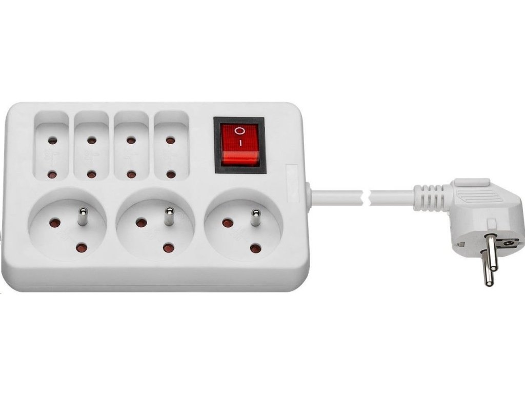 PremiumCord Predlžovací kábel 230V 1,5 m 3+4 zásuvky+vypínač - Počet zásuviek: 3 okrúhle zásuvky, 4 ploché zásuvky - Max.napätie: 250 V, max. 10A - Kábel H05VV-F 3G 1,5 mm2 - Kolískový spínač s indikáciou zapnutia - Detská poistka - Farba: biela - Balené v PE vrecku so závesným systémom. - Dĺžka kábla: 1,5 m.Dodatočné parametre