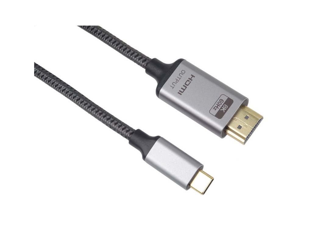 PremiumCord USB-C na HDMI kabel 2m rozlišení obrazu 8K@60Hz,4K@144Hz Aluminium Tento kabel umožňuje vysoce kvalitní převod videa a zvuku z USB-C na HDMI konektor pro monitor/TV/projektor. Funguje jako externí grafická karta s výstupem HDMI. Umožní rozšířit stávající plochu na dva monitory nebo ji zrcadlit na další monitor. Umožňuje také pracovat na dvou různých obrazovkách současně. Udělejte si svůj pracovní den více zábavný a pohodlnější, pracujte na dvou obrazovkách současně. - Rozlišení videa je až 8K@60Hz,4K@144Hz, FULL HD 1080p - Umožňuje zobrazení v módu: Mirror + Extend + Duplicate ( zobrazí se stejná nebo další obrazovka nebo jeden obraz přes dvě obrazovky ) - USB-C (DP 1.4) na HDMI 2.1 - Podpora výstupu zvuku i videa. - Může fungovat na nových Macbookech, Chromebookech, Asus Zen AIO a dalších zařízeních vybavených typem C z roku 2015. - Kompatibilní pro Mac, Windows, tablety, mobilní zařízení (Samsung S8, Note 8, LG G5 atd.) - Typ C reverzibilní konektory. - 1 x USB Type-C™ samec > 1 x HDMI-A 19kolíkový samec - Směr signálu: vstup USB Type-C™ > výstup HDMI - Rozlišení:8K@60Hz (7680*4320), 4K@144Hz (3840*2160), 2K@165Hz/240Hz - Datový tok: 48Gbps - Podporuje Thunderbolt 3 - Podporuje 3D zobrazení, HDR, HDCP 1.4 a 2.2 - Quick Media Switching(QMS),Auto Low Latency Mode(ALLM), Quick Frame Transport(QFT) - Zvuk: 1536kHz audio sample - Chipset: VMM7100 - Napájení ze sběrnice USB, není potřeba externí napájení - Plug & Play, podpora výměny za provozu - Kovové šedivé pouzdro, pozlacené konektory - Příjemně měkký kabel s bavlněným opletením - Stříbrno šedá barva kabelu a opletení - Délka: 2m. - Funguje s novými zařízeními s USB-C podporujícími DisplayPort Alternate modes Macbook Chromebook Asus Zen AIO Mac,Windows,Tablets,Mobile(Samsung S8/S8 plus, Note 8, LG G5, Mate10, LG V300, HTC U Ultra ) atd....Dodatočné parametre