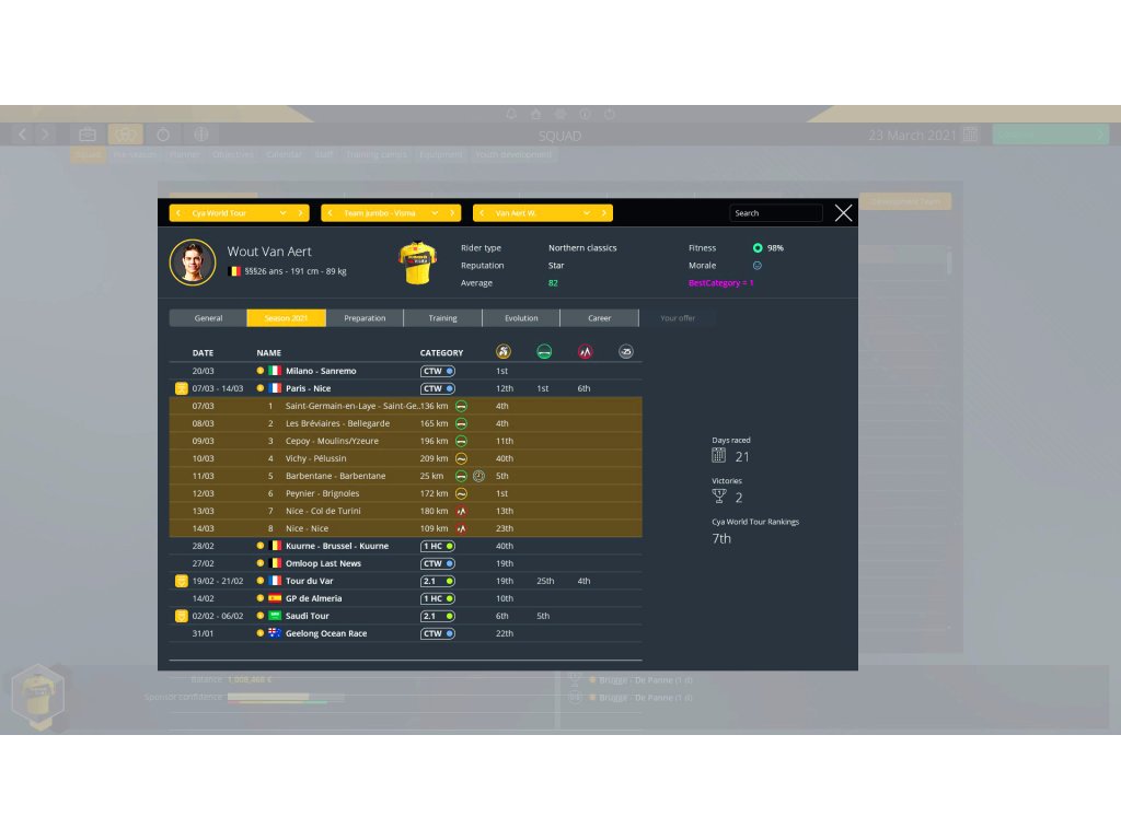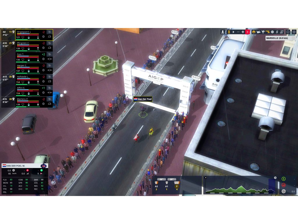 We have revised the objectives system to make it more realistic and to offer you more freedom. You can now set any number of objectives for all your riders (but too many objectives will certainly affect their fatigue). But you will have to constantly reconsider your choices during the season because unforeseen circumstances (fatigue, calendar changes, etc.) will affect the morale of your riders. We have also developed a new AI to manage riders' objectives and to improve allocation of leaders in the season's important races.
