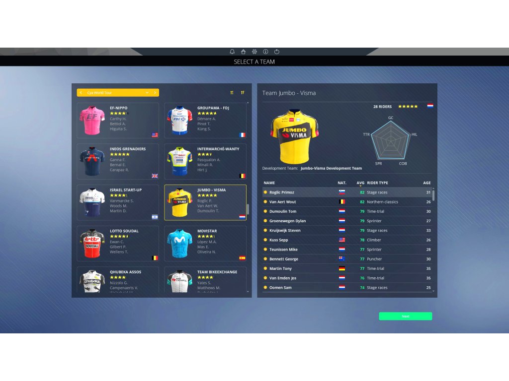 In this mode you create your own rider, join a team and improve your skills to try and win the world's most prestigious races… The Yellow Jersey awaits! Complete the objectives set by your manager to stand out and increase your negotiating power for future contracts in your team… or in another. Be careful of poor career decisions! Pro Cyclist mode features a skill tree for levelling up your rider based on objectives completed. Once you have proved yourself, you will become your team's leader, just like Primoz Roglic, Tadej Pogacar and Thibaut Pinot. Your teammates will then work to help you.