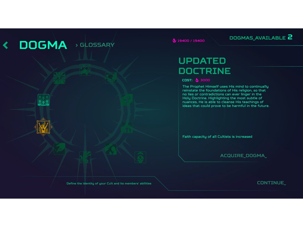 The overall direction of the one’s cult is defined by the dogmas chosen for it. From a peaceful religion to one that despises non-believers, each one of dozens of dogmas defines the way in which the cult will pursue its goals. But whichever way you decide to choose, your followers will all work together to build a strong and powerful cult...