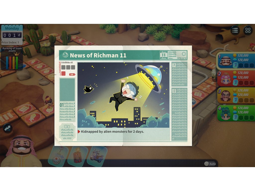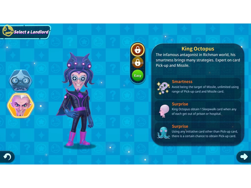 Richman 11 supports multi-controller, online and offline modes to choose. Players could create either free play or challenge play, all the parameters could be set based on players minds as well. In the game, players roll the dice and it determines the steps they could move on the map, earning money by investment on properties, buying stocks or using cards, when the game ends, the only player who are not broke or owns the most in finance wins the play.
