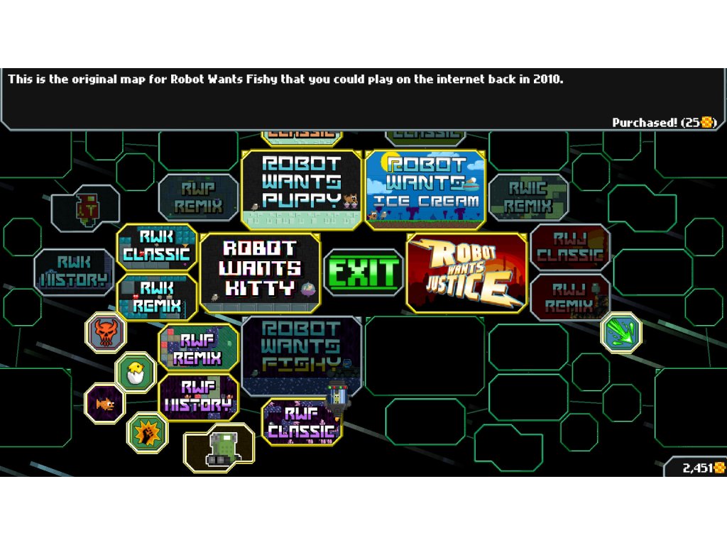 Robot wants stuff, so go get it for him! This game is a compilation of the original Robot Wants games from 2010: Robot Wants Kitty, Robot Wants Puppy, Robot Wants Fishy, and Robot Wants Ice Cream. In addition, it includes Robot Wants Y!?, a mini-game that was actually the main banner on the JayIsGames website for a while. And of course, Robot wouldn't be wanting it all if we didn't add Robot Wants Justice, a brand new Robot adventure!