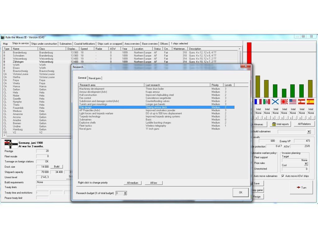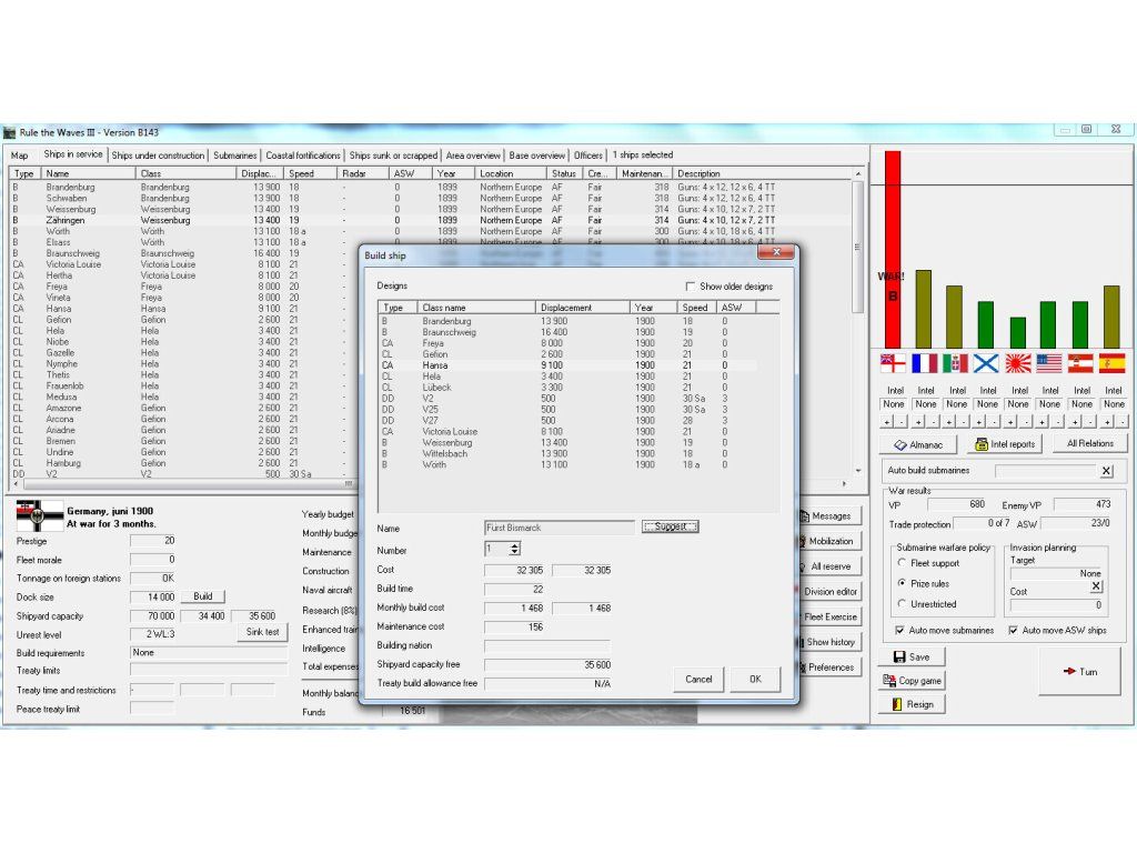 Build Your Navy, from pre-Dreadnoughts to Aircraft Carriers and Missile Cruisers! Rule the Waves III is a simulation of naval ship design and construction, fleet management and naval warfare from 1890 to 1970. It will place you in the role of 'Grand Admiral' of a navy from the time when steam and iron dominated warship design up to the missile age.