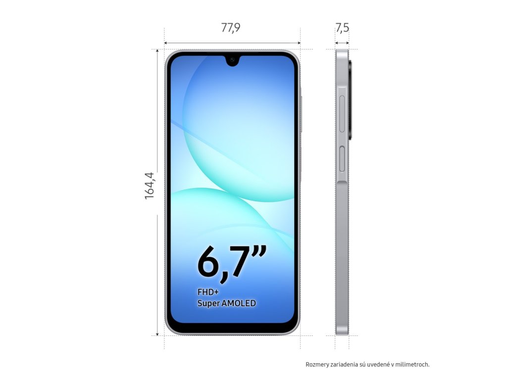 Teraz ešte tenší a štýlovejší. Vďaka hrúbke len 7,5 mm, sofistikovanému ergonomickému dizajnu bočných tlačidiel Key Island 2.0 a lineárnemu rozloženiu fotoaparátov je nový Galaxy A17 dokonalým spojením ležérnej elegancie a funkčnosti. Vybrať si môžeš z farebných prevedení Black, Gray a Blue.