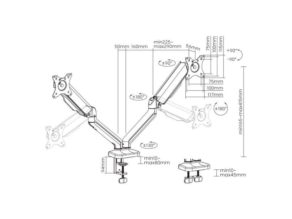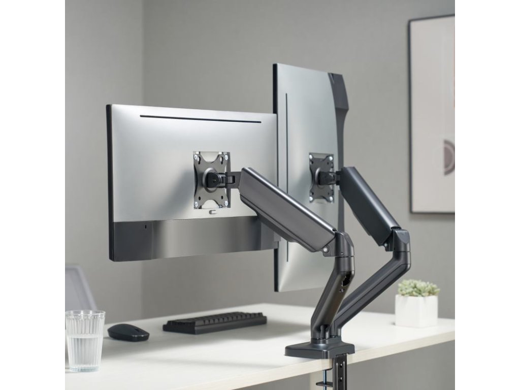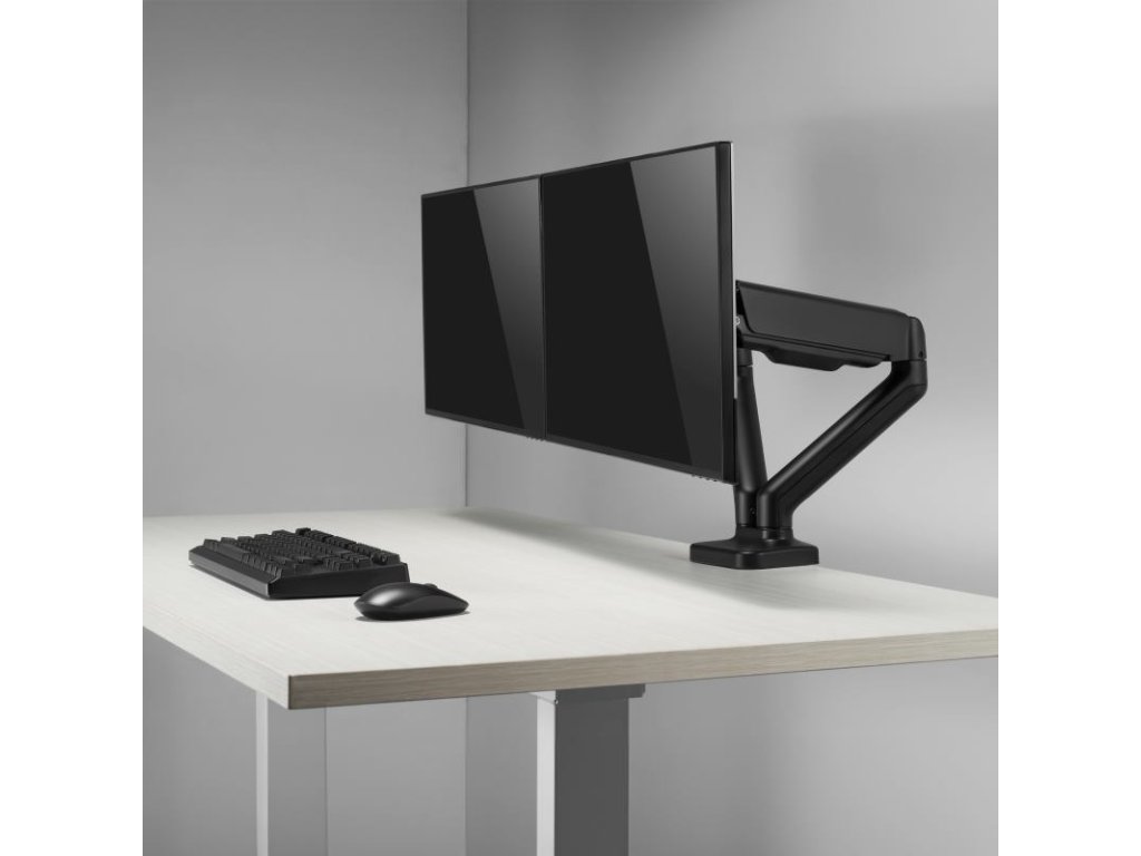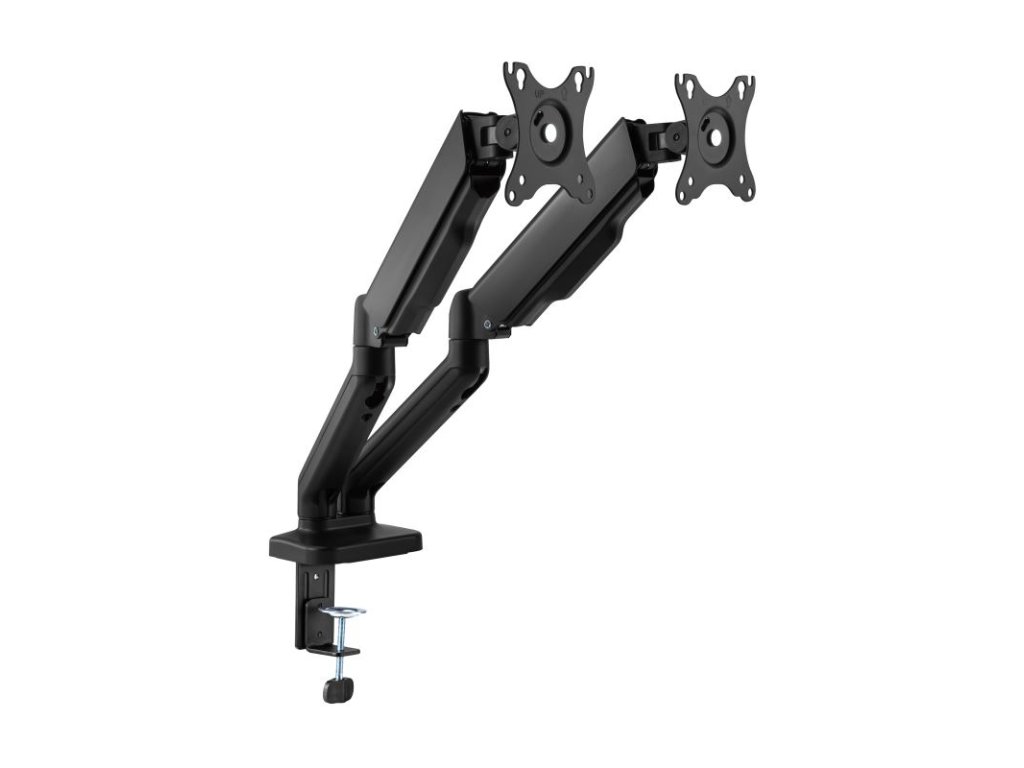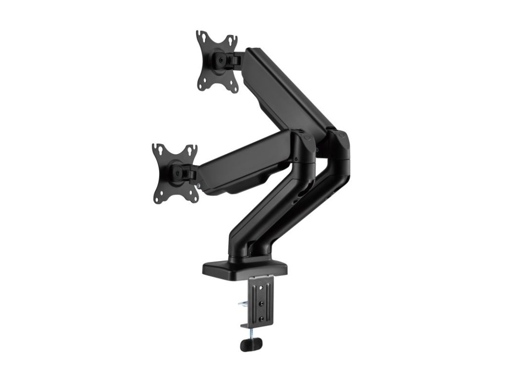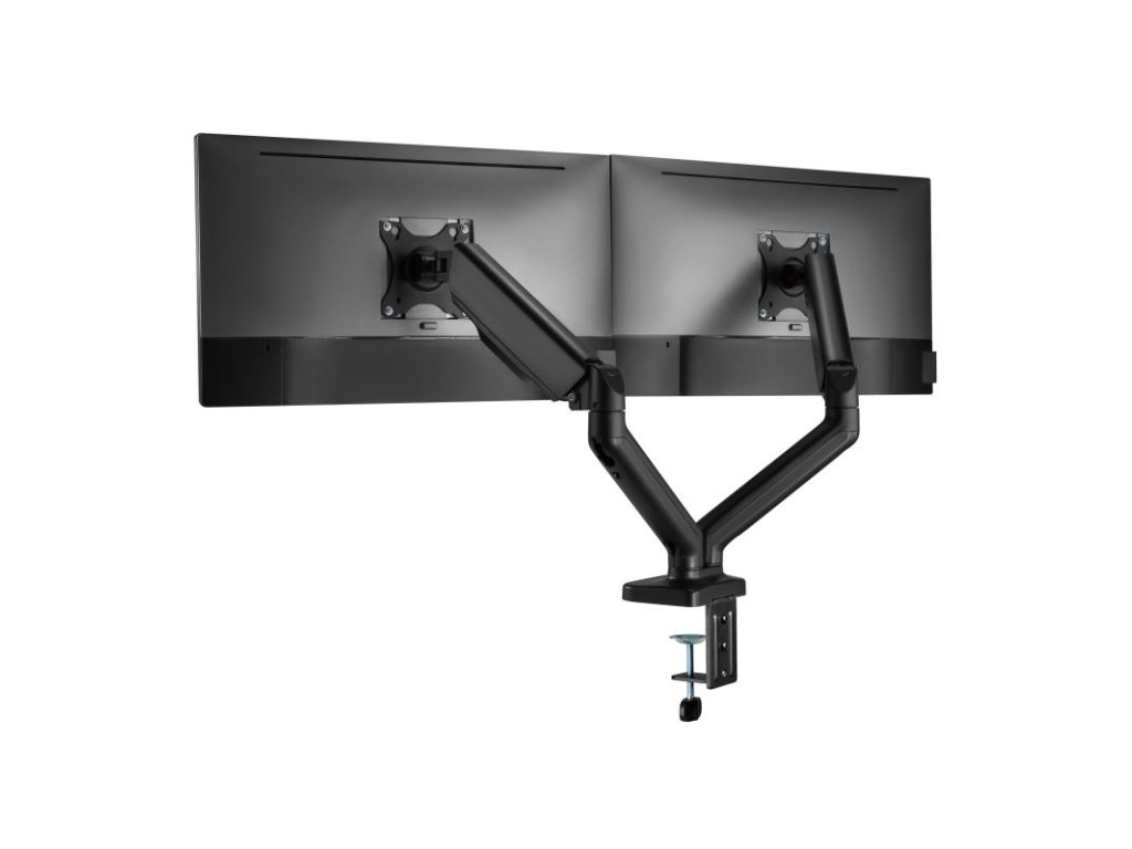 SBOX LCD-S024-2, Stolný držiak na 2 monitory 17" - 43" - Počet obrazoviek: 2, Minimálne VESA: 75x75, Maximálne VESA: 100x100, Maximálne zaťaženie (kg): 2x2-9, Minimálna veľkosť obrazovky: 17'' / 43 cm, Maximálna veľkosť obrazovky: 32'' / 81 cm, Vertikálny sklon: +90°/ -90°, Otočenie: +90° / -90°, Otáčanie obrazovky: +180°/ -180°, Pokrytie svorky (mm): svorka (10 - 80 mm), priechodka (10 - 45 mm), Materiál: hliník/oceľ/plast, Farba: Čierna, Povrchová úprava: Práškové lakovanie, Pre zakrivené obrazovky: Áno, Vedenie káblov: Áno, Odnímateľná doska VESA: Áno, Inštalácia: Stôl, Rozmery (mm): 937x105x570Dodatočné parametre