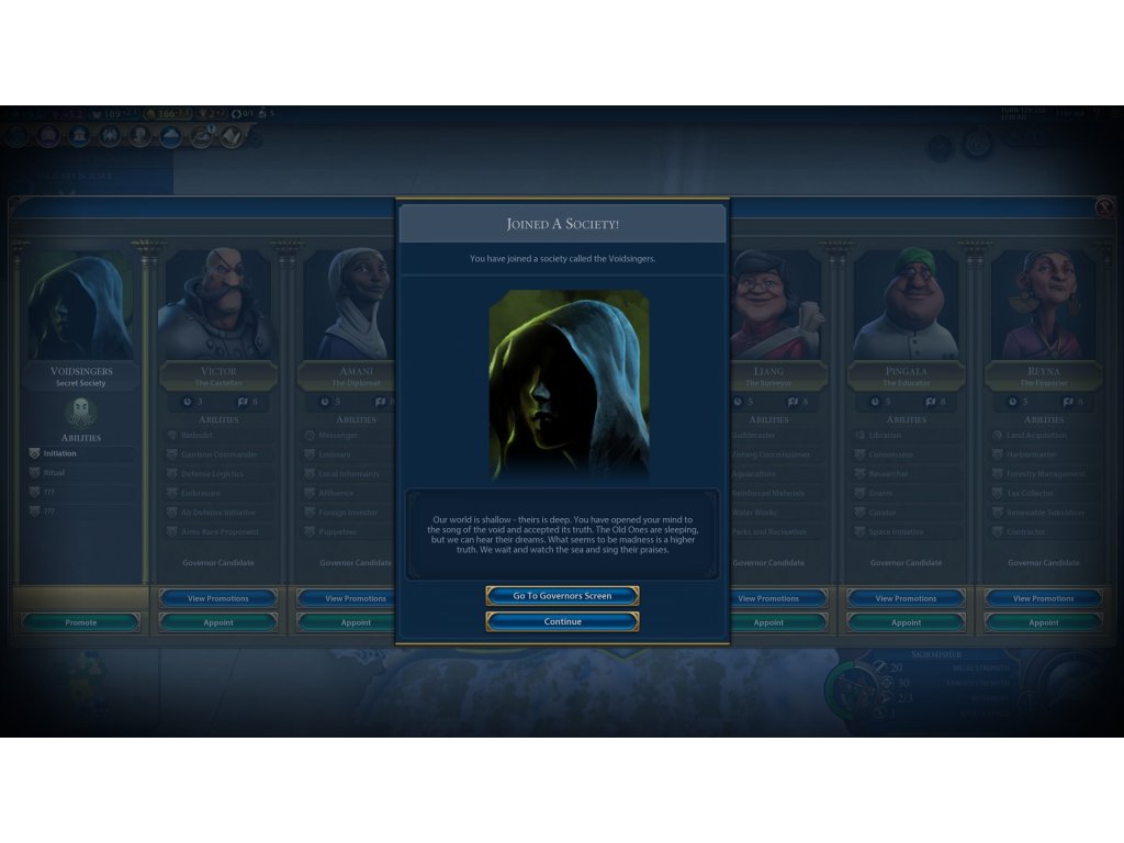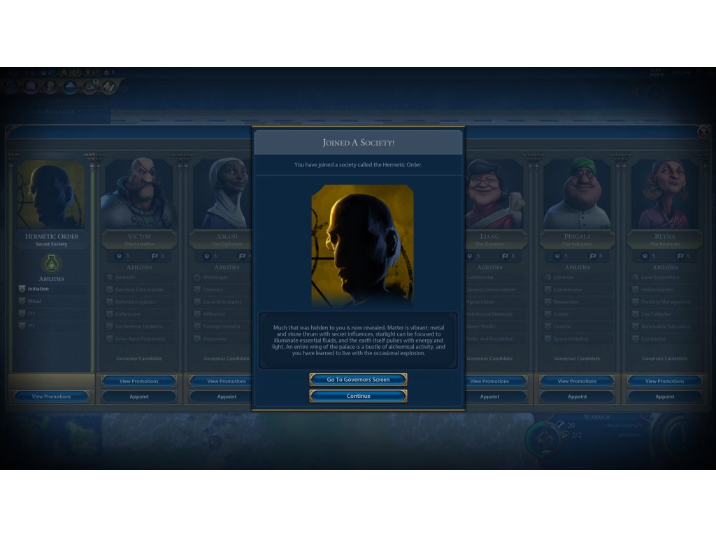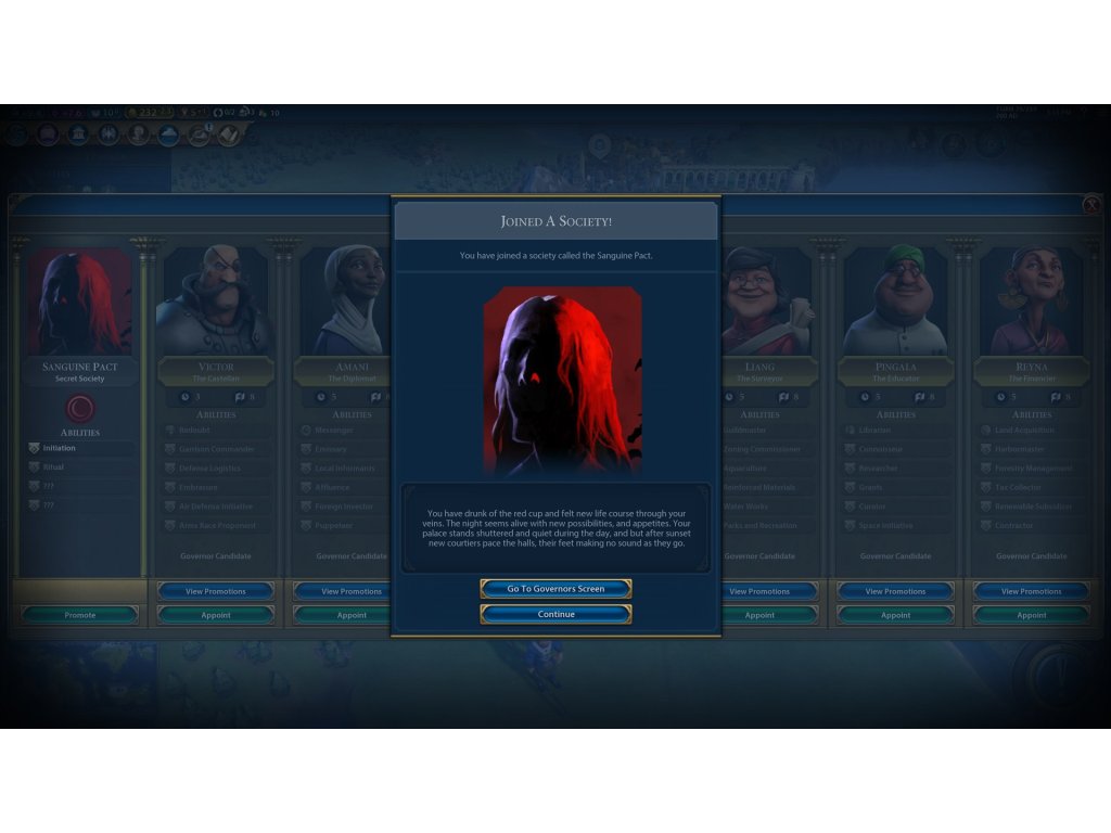 An optional, specialized game mode with exclusive rule changes:Adds four Secret Societies to the game.Each Secret Society offers players a specialized Governor who applies their bonuses across the entire civilization.Secret Societies may offer players new Resources, passive bonuses, unique buildings, units, or projects to further the Society’s ends.Use your Secret Society membership to boost favorability and Alliances with other leaders.