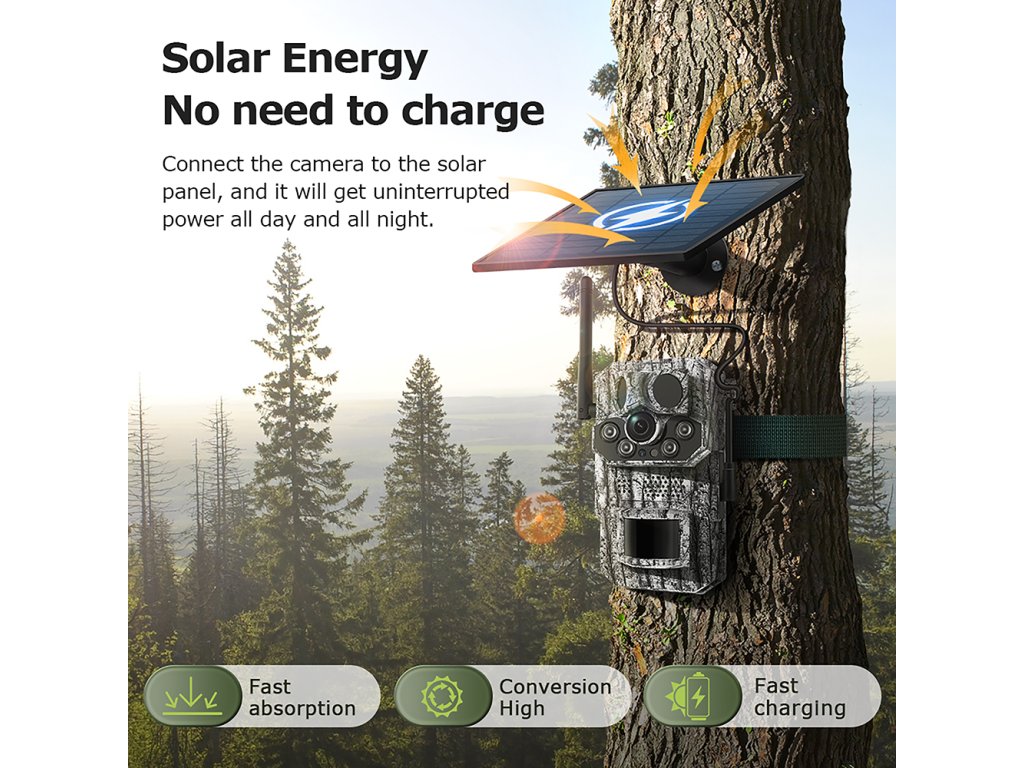 2304 x 1296 rozlišení · 4G připojení · PIR a pohybový senzor až 20m · barevné noční vidění až 20m · podpora TF karty až 128GB · cloudové úložiště · aplikace UCon · kapacita baterie 7800mAh · odolnost IP66 · vestavěný GPS modul · dvousměrný přenos zvuku · solární napájení · ovládání přes mobilní aplikaci · detekce teploty a rozpoznávání zvířat s AI