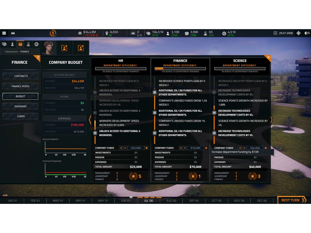 Take on new contracts. Launch different corporations into space and get rewarded with funds to develop your company further.