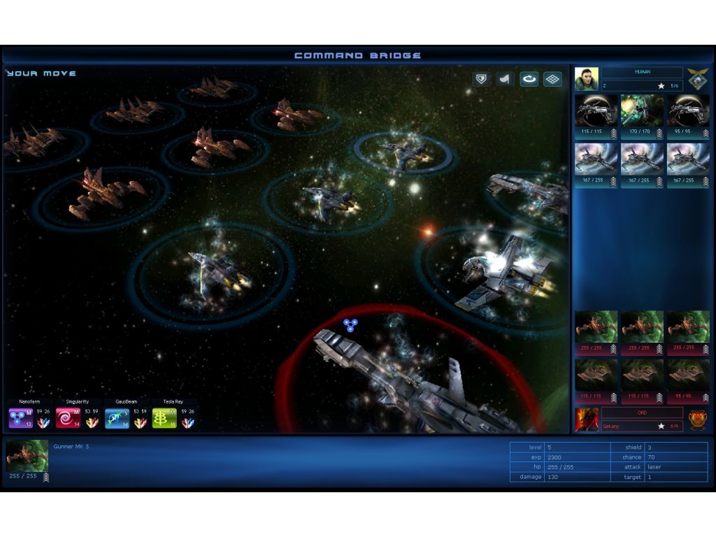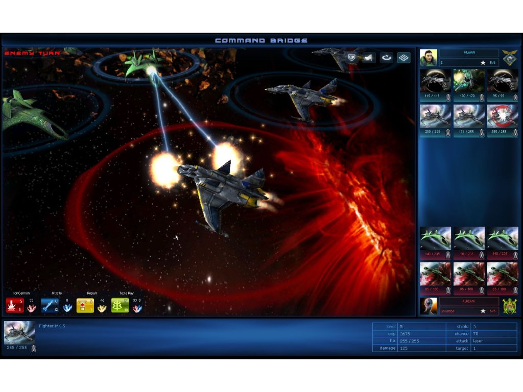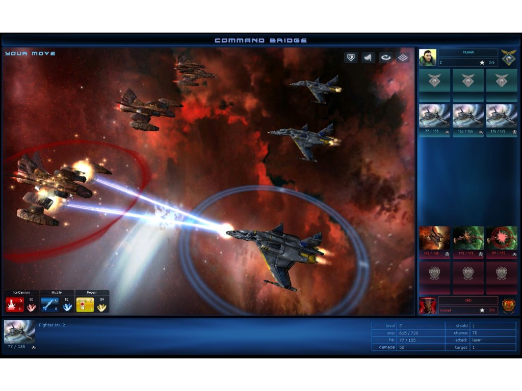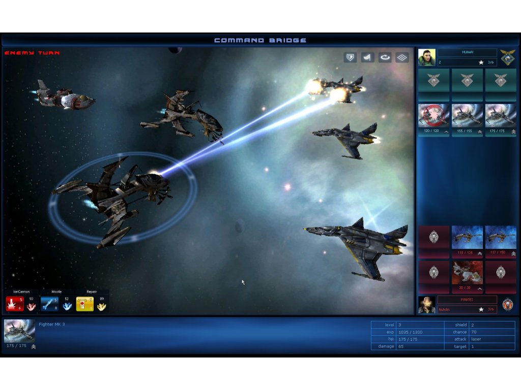 If you win, but have damaged crafts, return to the nearest base and mobilise available ships for the next mission. As the game progresses, depending on your leadership status, you have the option of selecting up to four spaceships with different abilities in every space station and a total of six in battle formation.Each spaceship can be upgraded by collecting experience points during combat. The current status is denoted by rank signs. Ships with more experience can withstand greater damage and deliver more powerful hits.