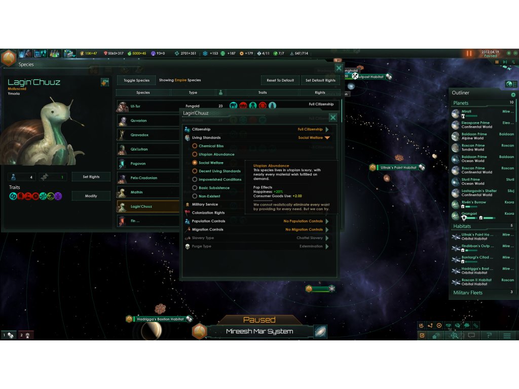 Stellaris is a real-time grand strategy game developed by Paradox Development Studio and published by Paradox Interactive. In Stellaris, the player becomes a leader of a space empire and their job is to expand it, form diplomatic relationships with other space nations, wage wars against hostile factions, etc. The Utopia expansion pack adds new features that expand the gameplay by adding new features, such as megastructures, habitats and many more.Stellaris Utopia adds several new features, which expand on the mechanics of game. The first of them are the megastructures. There are three types of megastructures, each serving a different purpose. Habitats are artificial planets which can be built and colonized by the player. Gateways serve as passages to different points of space. Ringworlds and Dyson spheres are constructions built in phases. Each phase provides different perks to the player and can also be inhabited.