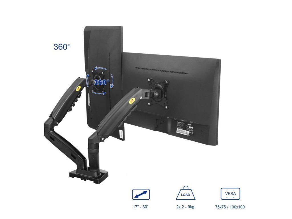 Stolný držiak na 2 monitory displeja NB F160 Stolný držiak na zavesenie 2 monitorov 17-30", nezávislé nastavenie každého monitora, výškové polohovanie 140-400mm, otáčanie do strán +/-180°, naklápanie +85°/-30°, vzdialenosť od uchopovacieho bodu 0-530mm, pivot +/-360°, VESA 75x75 a 100x100, nosnosť 18kg Vynikajúci stolný držiak na monitory a menšie televízory v profesionálnej kvalite, s pekným dizajnom, s množstvom nadštandardných možností nastavenia. Otáčanie obrazovky do strán, naklonenie nahor aj nadol vo vysokom uhle, nastavenie vzdialenosti od uchytenia, korekcia roviny obrazovky, horizontálne alebo vertikálne otočenie obrazovky, systém skrytého vedenia káblov. Výškové nastavenie až 400mm, výšková regulácia 260mm - veľmi jednoduchá manipulácia. Všetko v unikátnom dizajne. Držiak má veľmi odolnú a bezpečnú konštrukciu a je vhodný aj do veľmi vytížených prevádzok, kde je potrebná neustála manipulácia. Stolný držiak na 2 monitory NB F160 NB F160 kvalitný dvojmonitorový držiak na stôl, polohovateľný Držiak je vďaka možnosti úplnej nastaviteľnosti, profesionálnej konštrukcii a peknému dizajnu vhodný pre veľmi široké spektrum využitia. Odporúčame ako do domácností, tak kancelárií, pracovní, školských tried, nemocníc, call centier, IT pracovísk, prevádzok a firiem. Stolný multimonitorový držiak NB F160 - nezávislé zavesenie 2 monitorov na stolný držiakKancelársky stolný držiak na 2 PC monitory v TOP kvalite a dizajne - NB F160 Technické údaje: nosnosť 18kg podporuje VESA štandardy 75x75 a 100x100 odporúčame na monitory a televízory s uhlopriečkou 17" až 30" otáčanie na obe strany +180° až -180° nastavenie výšky monitorov 140-400mm naklonenie monitorov +85°/-30° vzdialenosť od stolového uchytenia 0-530mm horizontálne aj vertikálne otočenie obrazovky - funkcia pivot +/-360° systém pre vedenie káblov profesionálny držiak vyššej kvality 2 typy uchytenia na stolovú dosku - na okraj alebo skrz stolovú dosku 10-90mm záruka 5 rokov Kancelársky držiak na dva monitory NB F160 Kvalitný polohovací držiak na monitory do kancelárie NB F160Popis produktu bol preložený pomocou umelej inteligencie a môže obsahovať nepresnosti.