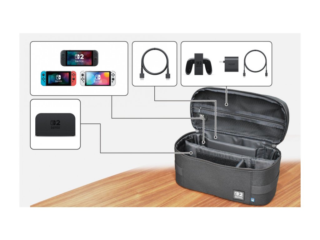 Komplexný úložný priestor "všetko v jednom": Už žiadne kompromisy! Táto taška je navrhnutá tak, aby bezpečne pojala vašu konzolu Nintendo Switch 2 (alebo staršie modely), dokovaciu stanicu, napájací adaptér, HDMI kábel, ďalšie Joy-Con™ ovládače, Pro Controller a ďalšie herné príslušenstvo.