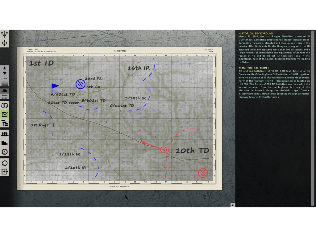 In the middle of March 1943, the 1st Ranger Battalion captured El Guettar oasis, meeting almost no resistance. Italian forces defending the oasis retreated and took up positions in the nearby hills. On March 20, the Rangers along with the 1st ID attacked them, captured more than 500 prisoners and a large number of ammunition and equipment. Units of 16 and 18 IR, 1st ID took positions in the mountains, east of the oasis, blocking Highway 15 leading to Gabes. The forces of 601 and 899 TD battalions were located in the second echelon, front to the highway. Artillery of the division took positions along the Keddab ridge. The German command transferred the most combat-effective 10 TD, which had more than 100 tanks and armored personnel carriers, and rapidly prepared a counter-offensive plan to capture El Guettar.Release Date: 2017-12-21