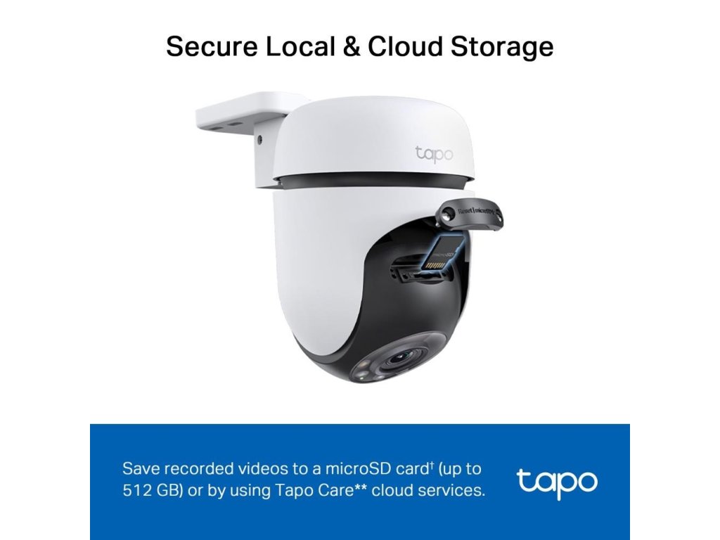 - Lokálne a cloudové úložisko: Ukladajte zaznamenané videá na microSD kartu (až 512 GB)† alebo prostredníctvom cloudových služieb Tapo Care**.