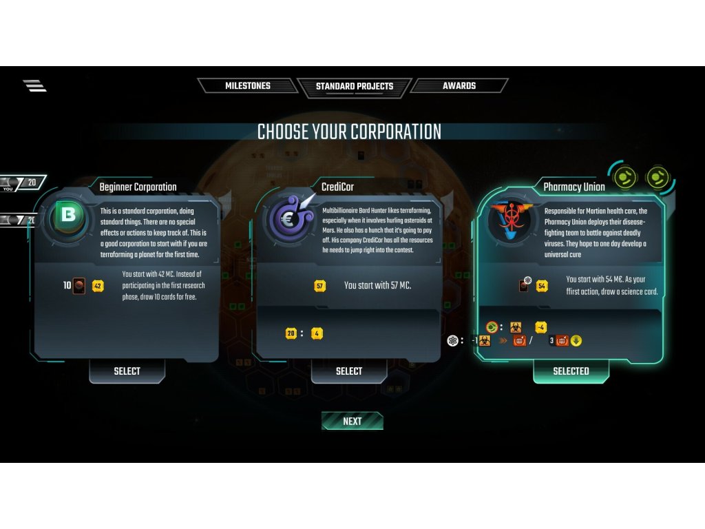 Add even more variety to your games with 23 new cards, including 2 corporations. Lead the Asteroid focused Astrodrill corporation– a new kind of resource – or join the Pharmacy Union, and its disease mechanic for expert players. Explore new horizons, broaden your strategies and create even more effective combos with cards such as Meat Industry, rewarding you each time you play an animal card or the almighty Asteroid Deflection System, protecting your plants from your opponent and raining points from above.