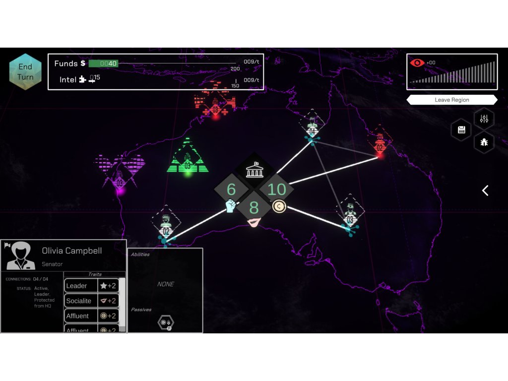 Manage your network, cut and create connections, to ensure you act from the shadows when the time is right.