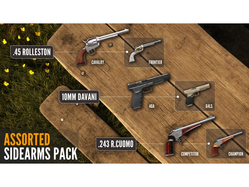 Add three versatile handguns to your hunting arsenal with the Assorted Sidearms Pack. These sidearms are ideal for self-defense against wild animal predators and a reliable alternative to your usual arsenal.