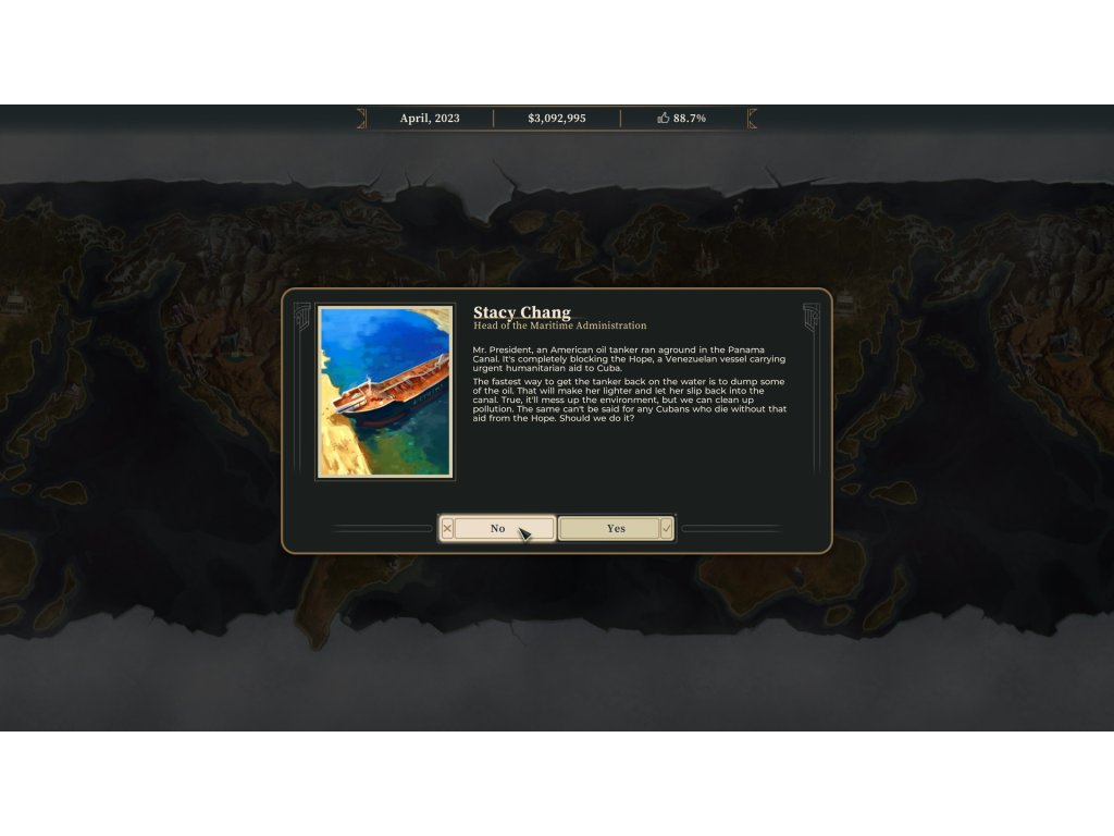 This Is the President is a political thriller. You are the newly elected leader with a shady background. It is up to you to abuse the position of the most powerful man in the world to escape justice for past crimes – even if that pitches the country into utter chaos.
