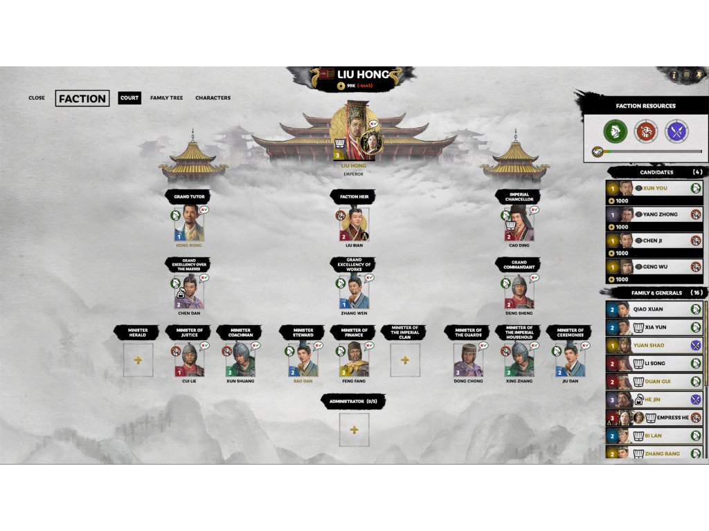 In Mandate of Heaven, Liu Hong (Emperor Ling) has a unique form of this Empire government style, in that he must request these mandated powers from his imperial allies in order to battle the Yellow Turban threat. In addition, he may also construct the Imperial Palace, a grand undertaking in both time and resources, which delivers powerful factionwide bonuses to the Emperor, and houses the single most powerful garrison in the game!