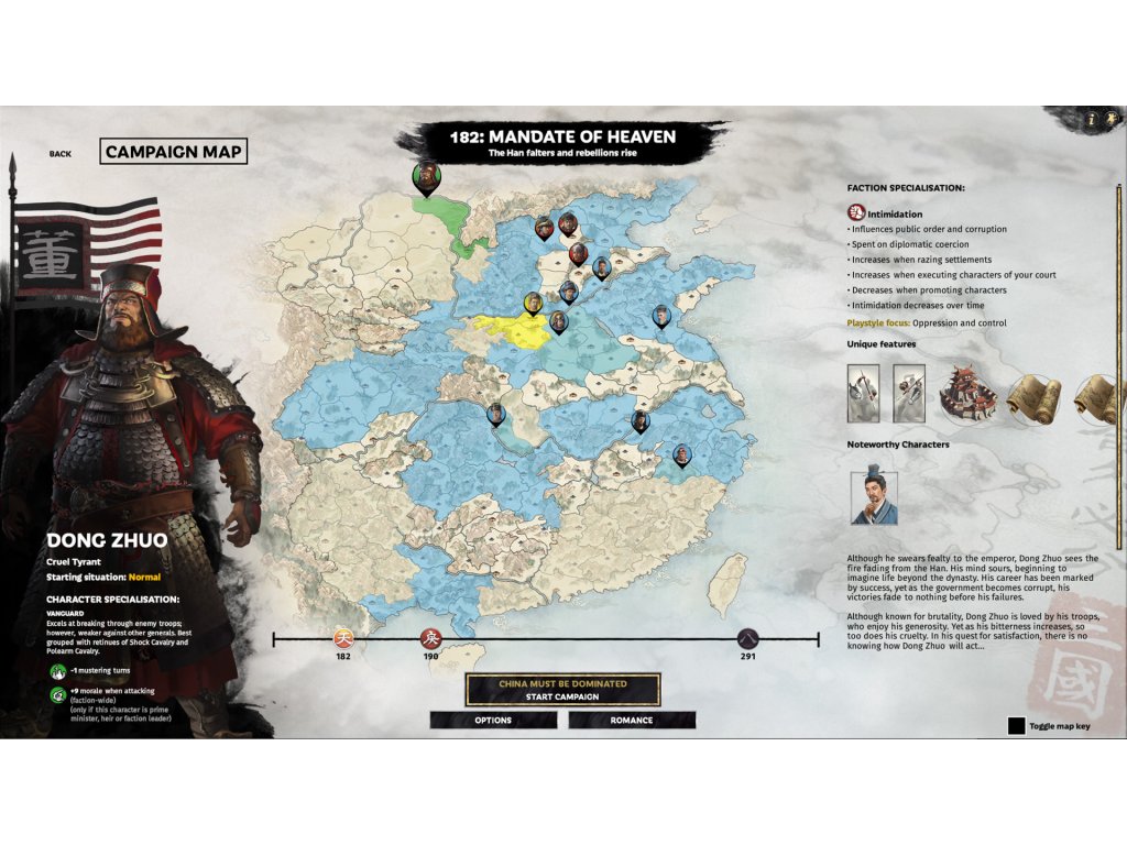 As time passes in the Mandate of Heaven campaign, notable factions from the 190 CE campaign will begin to emerge according to key historical conditions. For example, Yuan Shao may appear, but only if The Emperor is deposed, while Zheng Jiang will begin to terrorise the northern Commanderies around 189 CE.