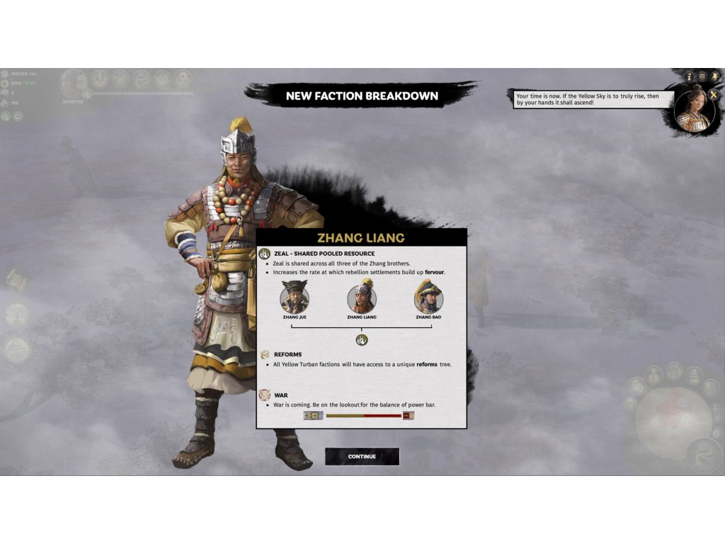 The Total War: THREE KINGDOMS – Mandate of Heaven Chapter Pack depicts the events of the Yellow Turban Rebellion, enabling players to engage in the conflict from either rebel or loyalist perspectives. Introducing a number of new characters and playable faction leaders, the campaign begins in 182CE, but players can choose to continue well into the Three Kingdoms period, with familiar characters entering the campaign as the timeline progresses.