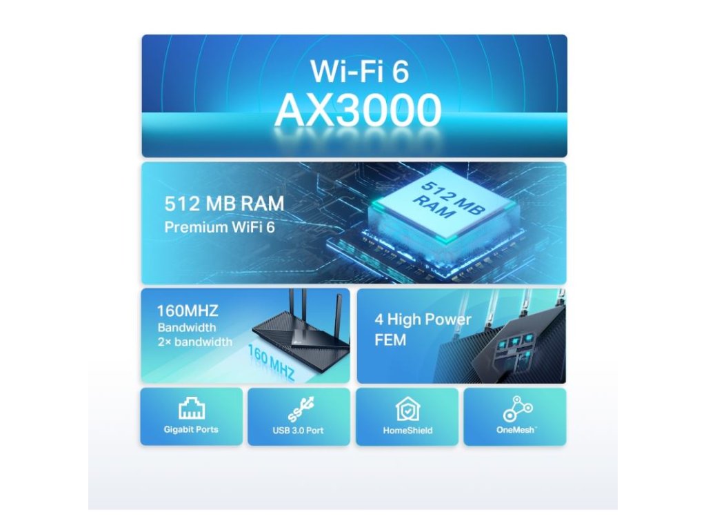 | Další vlastnosti: | Podpora IPv6, Rodičovská kontrola, QoS (Quality of service), Podpora Wi-Fi Mesh, Firewall, Síť pro hosty, Management |