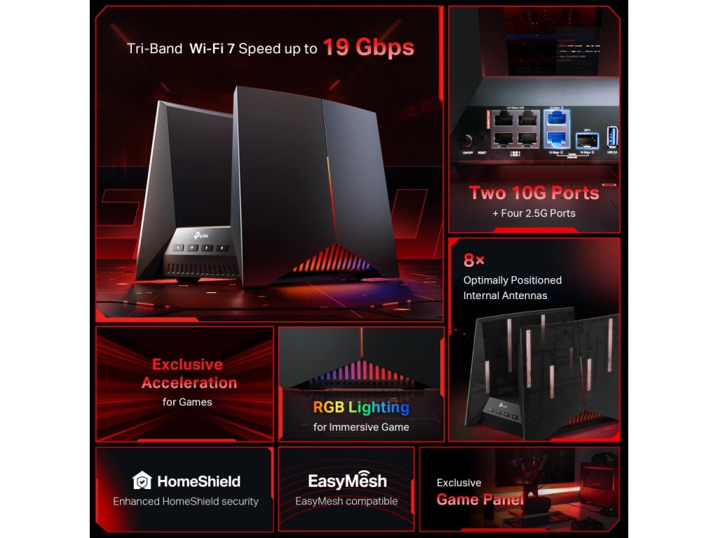 BE19000 Tri Band Wi-Fi 7 Gaming Router SPEED: 1376 Mbps at 2.4 GHz + 5760 Mbps at 5 GHz + 11520 Mbps at 6 GHz SPEC: 8× I