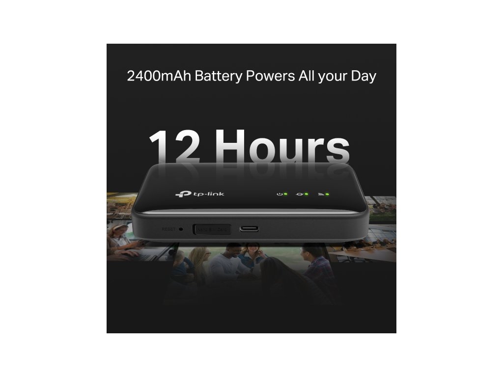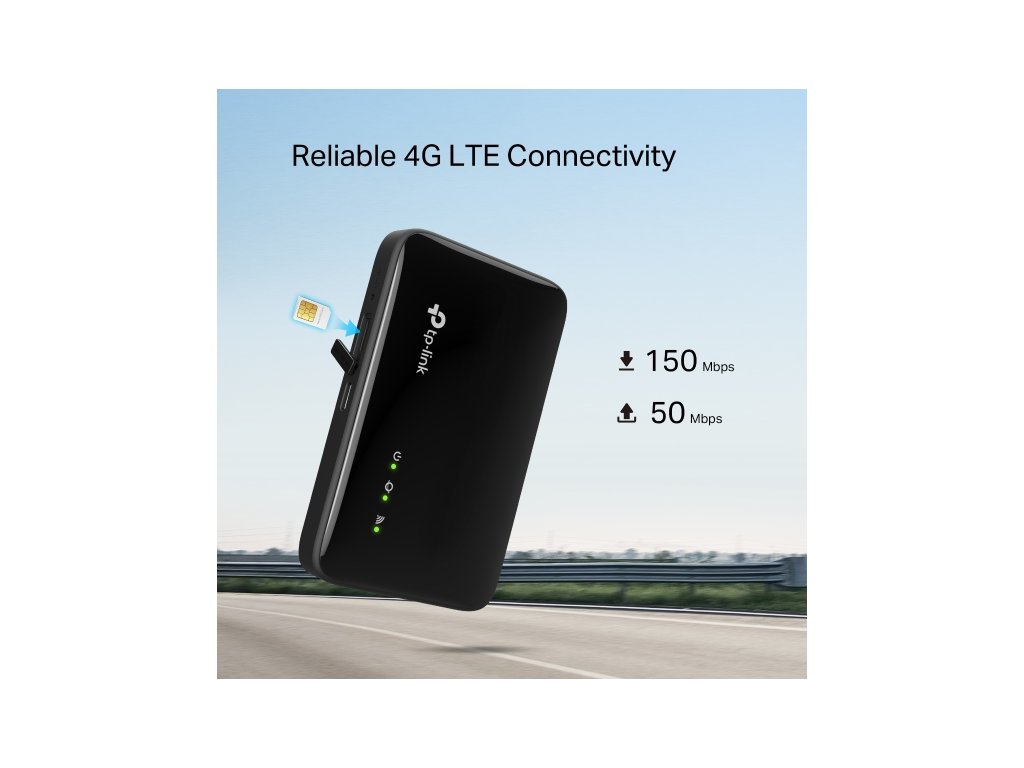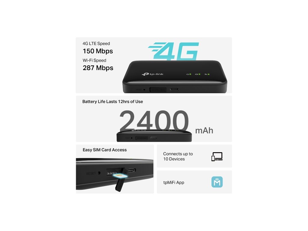 4G LTE Mobile Wi-Fi Užívejte si rychlé 4G LTE připojení až pro 10 zařízení najednou a Wi-Fi 6 na 2,4GHz s rychlostí až 287Mb/s. Díky kompaktní baterii 2400mAh vydrží hotspot až 12 hodin provozu a snadno se spravuje přes aplikaci tpMiFi. *Podpora 4G LTE s rychlostí až 150 Mb/s při stahování a 50 Mb/s při odesílání. 1 *Wi-Fi 6 na frekvenci 2,4 GHz s rychlostí až 287 Mb/s. *Baterie 2400 mAh umožňuje až 12 hodin provozu na jedno nabití. 3 *Boční přístup k SIM kartě – není třeba sundávat zadní kryt. *Podpora až 10 připojených zařízení současně. 2 *Snadná správa přes aplikaci tpMiFi.