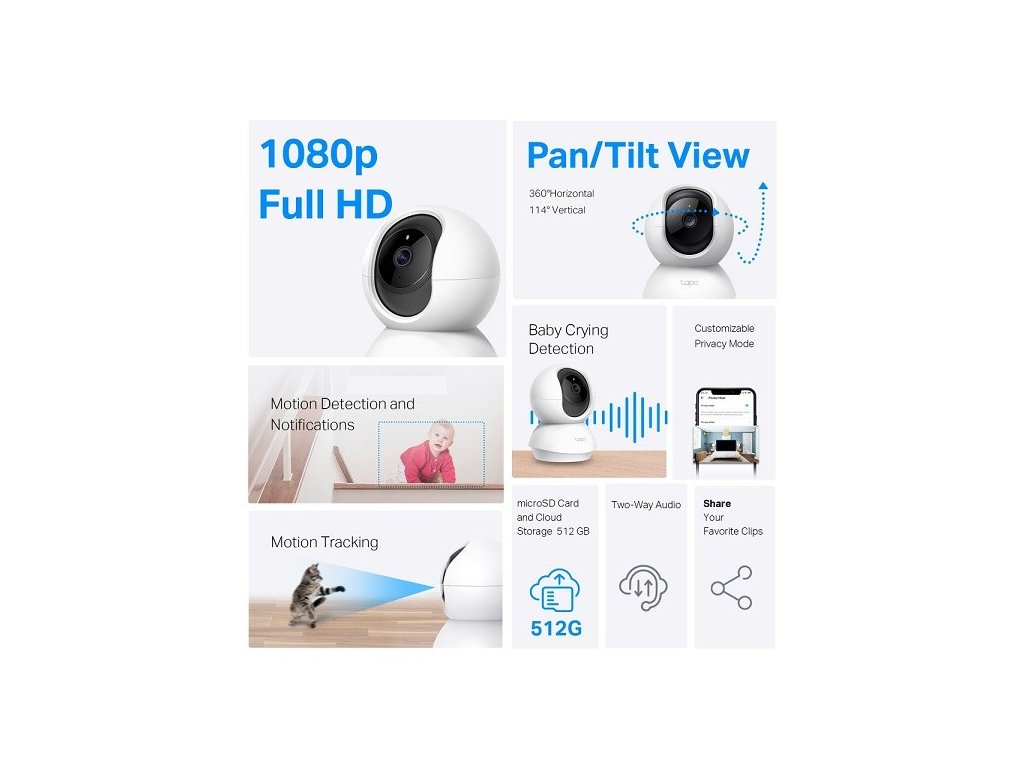 Video s vysokým rozlišením: Tapo C200C je vybaven videem ve vysokém rozlišení 1080p, které uživatelům poskytuje jasné a detailní záběry. Až 9násobný digitální zoom umožňuje uživatelům vidět ostřejší zobrazení zájmových oblastí. Otáčení a naklápění: Zařízení nabízí 360° horizontální a 114° vertikální rozsah, což umožňuje kompletní pokrytí oblasti. Noční vidění: Díky pokročilému nočnímu vidění až do vzdálenosti 12 metrů umožňuje kamera Tapo C200C uživatelům nepřetržité sledování domácnosti. Detekce pohybu a výstrahy: Zařízení využívá inteligentní technologii detekce pohybu, která odesílá okamžitá upozornění do telefonu, kdykoli je detekován pohyb. Obousměrný zvuk: Tapo C200C je vybaveno vestavěným mikrofonem a reproduktorem, které uživatelům umožňují komunikovat s rodinou, domácími mazlíčky nebo varovat před nevítanými hosty. Lokální úložiště: Zařízení podporuje karty microSD s kapacitou až 512 GB pro lokální úložiště, což představuje bezpečný a cenově výhodný způsob ukládání záznamů. Režim ochrany soukromí: Uživatelé mohou aktivovat režim ochrany soukromí, aby zastavili nahrávání a mohli kontrolovat, kdy kamera monitoruje a kdy ne. Snadné nastavení a správa: Pomocí aplikace Tapo mohou uživatelé snadno nastavit a spravovat kameru Tapo C200C a získat přístup k živému vysílání a dalším ovládacím prvkům. Hlasové ovládání: Tapo C200C je kompatibilní s aplikacemi Google Assistant a Amazon Alexa, takže uživatelům nabízí ovládání bez použití rukou. Bezpečné šifrování: Zařízení využívá pokročilé šifrování a bezdrátové protokoly, které zajišťují soukromí dat a bezpečnou komunikaci mezi telefonem a zařízením. FOTOAPARÁT Obrazový snímač 1/2,8'' progresivní skenovací CMOS snímač (ne senzor hvězdného světla) Čočka Ohnisková vzdálenost: 4,0 mm , Clona: 2,0, Zorné pole: 93° (diagonálně), 83° (horizontálně), 40° (vertikálně) Rozsah pohybu Mechanický rozsah otáčení: 340° (pokrytí otáčení 360°) Mechanický rozsah náklonu: 70° (pokrytí náklonu 110,8°) Noční vidění IR LED 850 nm (12 m) Osvětlení / Rozhraní a tlačítko 1× Tlačítko RESET 1× Slot pro kartu MicroSD (až 512 GB) Kompatibilita s nábojem / Centrum Kompatibilita zařízení / Kapacita připojení / Rozhraní a tlačítko / VIDEO A AUDIO Maximální rozlišení 1080P HD (1920 x 1080 pixelů) Snímková frekvence 15/20/25/30 snímků za sekundu (výchozí 15 snímků za sekundu) Digitální zoom 9x Komprese videa H.264 Živý náhled Ano Vylepšení obrazu 3DNR s širokým dynamickým pásmem Audio vstup a výstup Vestavěný mikrofon a reproduktor Zvuková komunikace Obousměrný zvuk s potlačením hluku Hlasitost sirény 93 dB (Hladina měřena ve vzdálenosti 10 cm) UKLÁDÁNÍ Lokální úložiště Slot pro kartu MicroSD ve fotoaparátu (až 512 GB) Cloudové úložiště Cloudové úložné služby Tapo Care (vyžaduje se předplatné) DETEKCE a OZNÁMENÍ Senzor / Detekce umělé inteligence Detekce pohybu Detekce osoby Detekce pláče dítěte Zóny aktivit Ano *Funguje pouze s detekcí pohybu. Výstupní oznámení Systémové oznámení Systémové oznámení se snímkem (služby péče Tapo) Systémové oznámení s klipy (služby péče Tapo) SÍŤ Připojení k síti Připojení přes Wi-Fi Bezdrátové připojení IEEE 802.11b/g/n, 2,4 GHz Wi-Fi Ethernetový port / RTSP Ano ONVIF Ano ZABEZPEČENÍ Zabezpečení Strojové učení na zařízení 128bitové AES šifrování s SSL/TLS WPA/WPA2-PSK MOC Zdroj energie 9V stejnosměrný napájecí adaptér Vstupní napětí Vstup adaptéru: 100–240 V, 50/60 Hz Výstupní napětí Výstup adaptéru: 9 V, 0,6 A OBECNÉ Osvědčení / Inteligentní integrace / Odolnost proti povětrnostním vlivům / Možnosti montáže Stolní stropní montáž Provozní teplota 0?~40? Skladovací teplota -20?~60? Provozní vlhkost 10 % ~ 90 % relativní vlhkosti, bez kondenzace Skladovací vlhkost 5 %~90 % relativní vlhkosti, bez kondenzace Nabíjecí teplota / Obsah balení Napájecí adaptér pro kameru Tapo C200C Stručný návod k obsluze Montážní šrouby Montážní šablona Samolepka Montážní kotvyDodatočné parametre