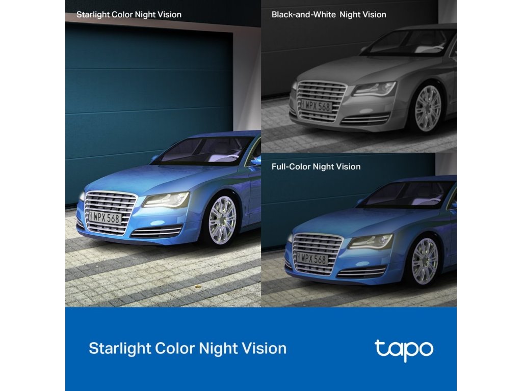 Farebné nočné videnie so snímačom Starlight - Kamera Tapo C520WS s objektívom s vysokou svetelnosťou F1,6 a snímačom Starlight zachytáva viac svetla a má vyššiu svetelnú citlivosť, takže za slabšieho osvetlenia vykresľuje jasnejšie farby ako farebné kamery s nočným videním osadené objektívom so svetelnosťou F2,2.