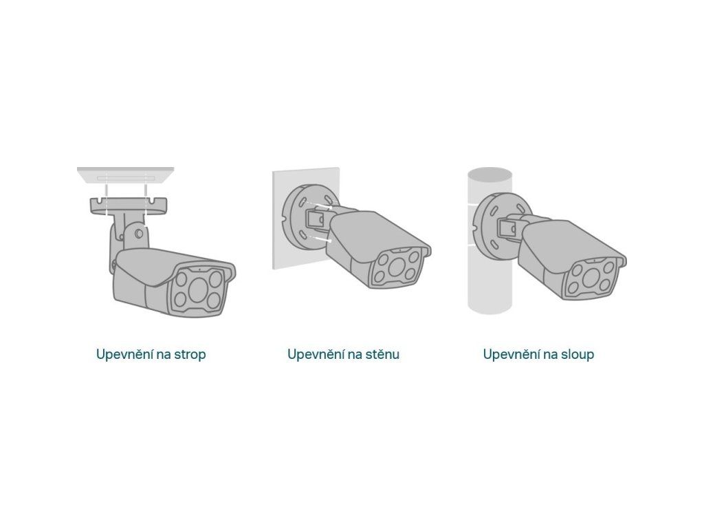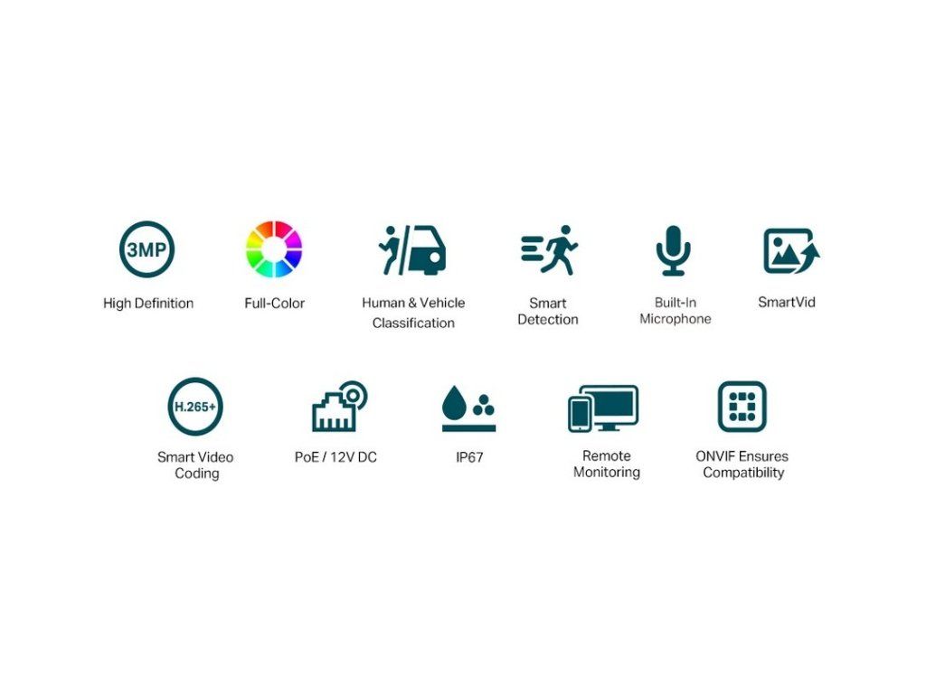 VIGI C330(2.8mm) je 3 megapixelová venkovní bullet kamera značky TP-Link s fixním objektivem 2.8mm, bílým světlem a IR přísvitem do vzdálenosti 30m a ethernetovým portem s podporou PoE. Kamera má max. rozlišení 2304 × 1296 px (při 30 fps), pozorovací úhel 108°, 2 nezávislé streamy, krytí IP67, digitální WDR snímač, zabudovaný audio mikrofon, podporu ONVIF, kodeku H.264(+) a H.265(+). Kamera díky větší citlivosti 0,005 Luxu podporuje tzv. Full-Color barevný obraz během celé noci. Kameru je možné napájet jak přes 12V DC konektor, tak přes 802.3af PoE po ethernetovém kabelu. Klíčové vlastnosti Rozlišení 3MP Objektiv 2.8mm, pozorovací úhel 108° IR a bílé světlo na 30m Podpora DWDR a 3D DNR (1) 10/100 Mbps LAN Krytí proti vodě IP67 Napájení 802.3af PoE nebo 12V DC jack, max. spotřeba 5,4W 24h barevný obraz (Full-Color): Díky objektivu s velkou clonou, vysoce citlivému snímači a připojeným doplňkovým bílým LED světlům získáte 24hodinové barevné detaily i v černočerných podmínkách Rozlišení osob a vozidel: Rozlišuje lidi a vozidla od ostatních objektů, takže dostáváte přesnější oznámení o událostech Inteligentní detekce: Přijímejte oznámení a kontrolujte kanály, když někdo překročí hranici, vstoupí do nastavené oblasti Technické parametry Kamera WDR:Digitální Typ objektivu:Fixní Objektiv [mm]:2,8 (fixní) Přísvit:IR, Bílé světlo Dosah přísvitu [m]:30 Pozorovací úhel [°]:108 Režim den/noc:Barevný Citlivost senzoru [Lux]:0,005 Obrazový senzor ["]:1/2.8 Obraz Rozlišení:3MP Technologie a vymoženosti:Full-Color Max. rozlišení [pixely]:2304 x 1296 Konektory a rozhraní Audio:Mikrofon Rychlost LAN:(1) 10/100Mbps Napájení Napájení přes PoE:802.3af Typ napájení:DC konektor, PoE Max. spotřeba energie [W]:5,4 Napájení přes konektor/svorkovnici:12V DC Fyzické charakteristiky Stupeň krytí:IP67 Použití:Venkovní Provozní teplota [°C]:-30 až 60 Hmotnost [g]:260 Šířka [mm]:78 Výška [mm]:70 Hloubka [mm]:174 Barva:Bílá Kompresní standardy Datový tok:256Kbps ~ 4Mbps Počet streamů:2 Video komprese:H.264 Obecné Kamerová řada:VIGI Obsah balení Zařízení Šroubky Montážní příslušenstvíDodatočné parametre