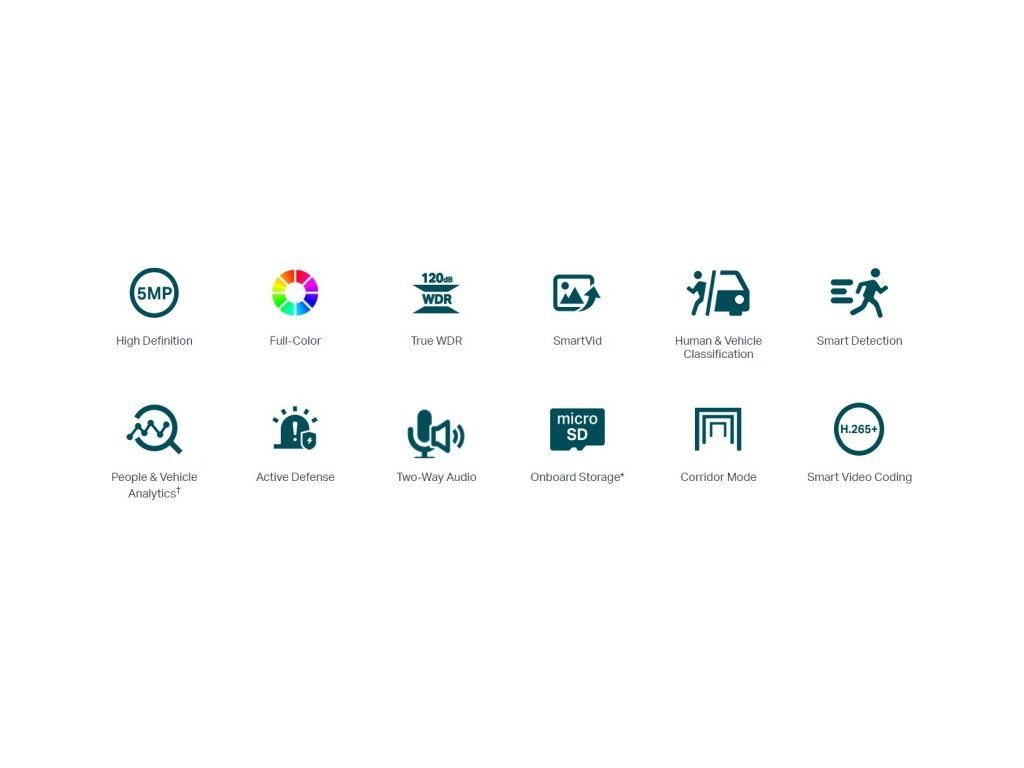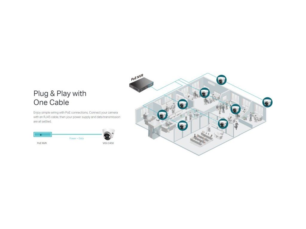 VIGI C450(4mm) je 5 MP vnitřní Turret kamera značky TP-Link s fixním objektivem 4 mm, bílým světlem a IR přísvitem do vzdálenosti 30 m a ethernetovým portem s podporou PoE. Kamera má max. rozlišení 2880 × 1620 px (při 30 fps), pozorovací úhel 90°, 2 nezávislé streamy, digitální WDR snímač, obousměrné audio (mikrofon i reproduktor), slot na microSD kartu, podporu ONVIF a kodeku H.264(+) včetně H.265(+). Kamera díky větší citlivosti podporuje tzv. Full-Color barevný obraz během celé noci. Kameru je možné napájet přes 12V DC konektor, případně po ethernetovém kabelu přes 802.3af/at PoE. Technické parametry Kamera WDR:Digitální Typ objektivu:Fixní Objektiv [mm]:4 (fixní) Přísvit:IR, Bílé světlo Dosah přísvitu [m]:30 Pozorovací úhel [°]:90 Režim den/noc:IR cut filtr Citlivost senzoru [Lux]:0,005 Obrazový senzor ["]:1/2.7 Obraz Rozlišení:5MP Technologie a vymoženosti:Full-Color Max. rozlišení [pixely]:2880 x 1620 Konektory a rozhraní Slot na paměťové karty:microSD - až 256GB Audio:Mikrofon, Reproduktor Rychlost LAN:(1) 10/100Mbps Napájení Napájení přes PoE:802.3af, 802.3at Typ napájení:PoE, DC konektor Napájení přes konektor/svorkovnici:12V DC Fyzické charakteristiky Použití:Vnitřní Tlačítka:Reset Provozní teplota [°C]:-30 až 60 Hmotnost [g]:400 Šířka [mm]:123 Výška [mm]:84 Hloubka [mm]:123 Barva:Bílá Kompresní standardy Datový tok:256Kbps ~ 6Mbps Počet streamů:2 Video komprese:H.264, H.265 Obecné Kamerová řada:VIGI Obsah balení Zařízení ŠroubkyDodatočné parametre