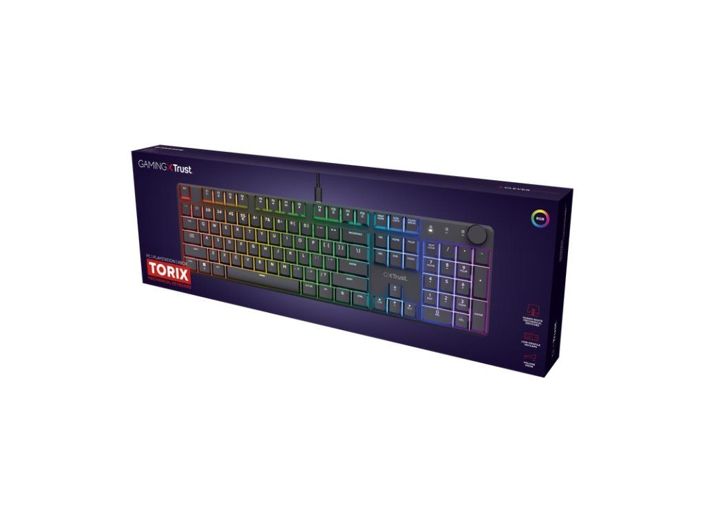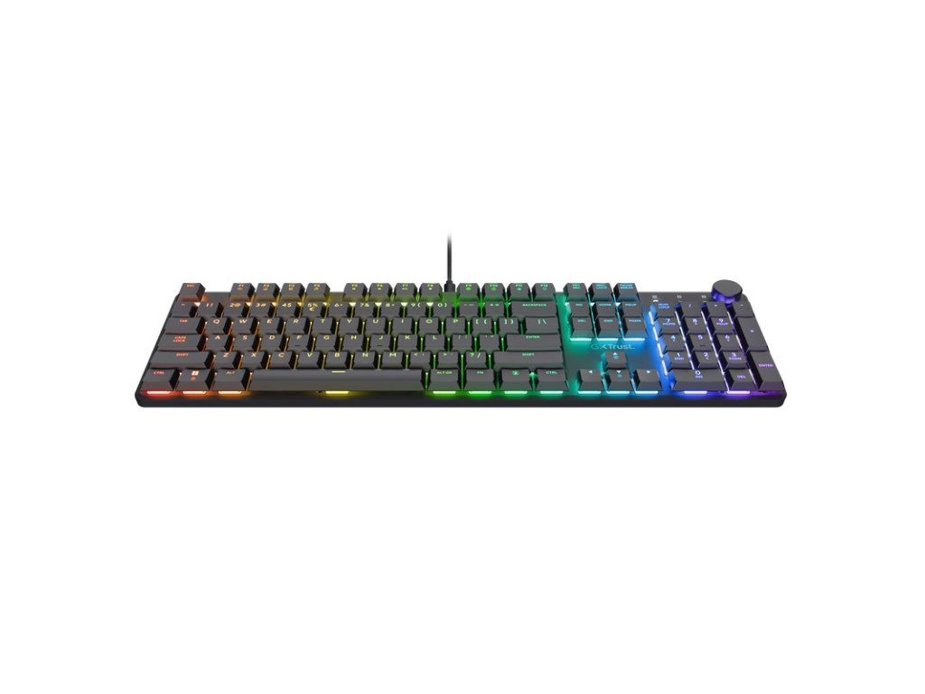 Trust Gaming GXT 866 Torix mechanická herní klávesnice plné velikosti s plným RGB podsvícením * plně nastavitelné RGB s 16,8 miliony barev * funkce anti-ghosting * nízkoprofilové klávesy * lineární mechanické spínače Huano * samostatný knoflík pro ovládání hlasitosti