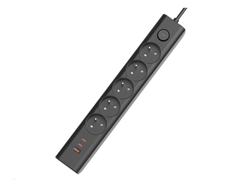 Viking síťová prodlužovací zásuvka YC53, 5x AC 230V, 1x USB-A, 2x USB-C, délka 1,5 m, černá