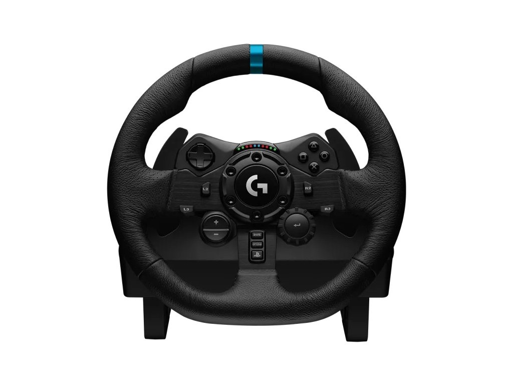 Logitech G923 TRUEFORCE Sim Racing Wheel * ovládací prvky pro PS5 nebo PS4 jsou integrovány přímo do volantu * volant z ručně šité kůže * integrované barevné indikátory LED označují rozsah otáček v podporovaných hrách * brzdový systém * pedály z válcované oceli