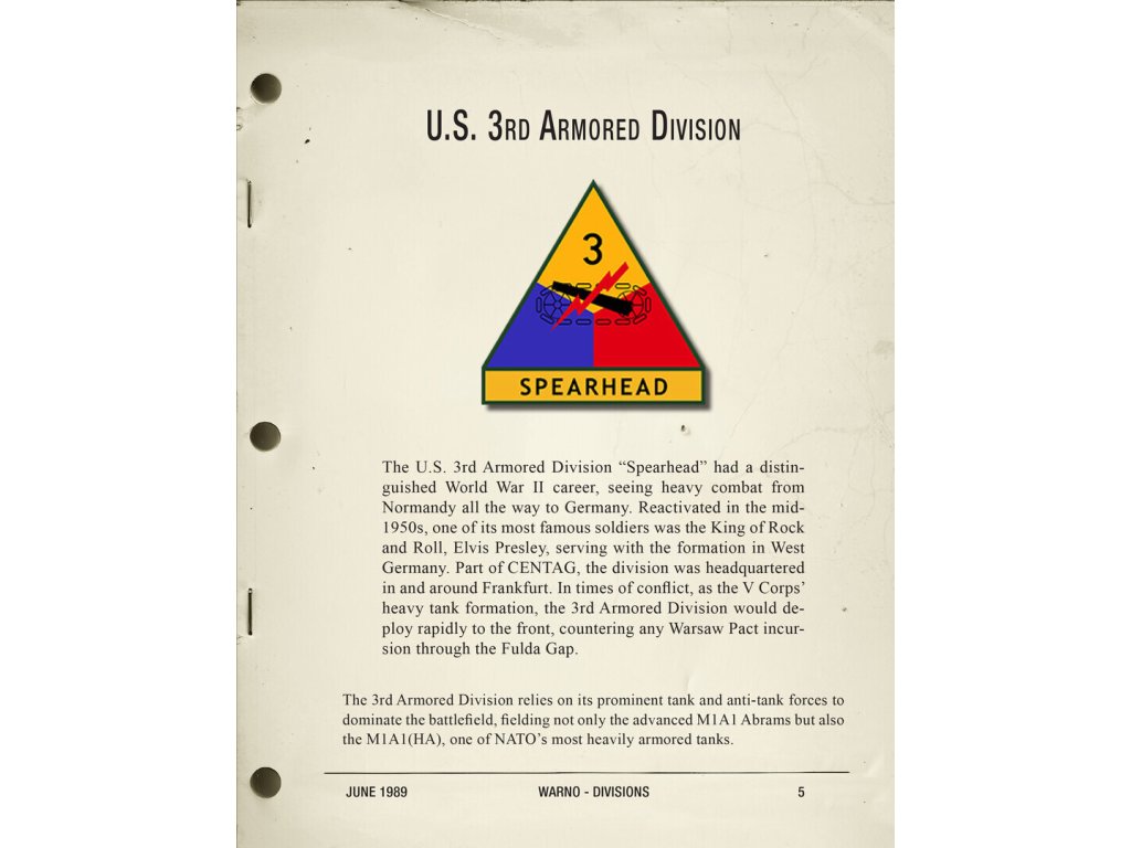 - Divisions. An exhaustive list of all WARNO divisions, including historical tidbits, arsenal and unit descriptions, advantages and disadvantages, and how to best deploy each battlegroup’s armed forces.
