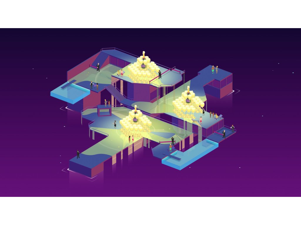 Natural habitats contort into underwater parks, wildlife stacks into animal towers, mushroom clouds become cloud cities with gift shop mazes, and twisting black holes curve in space. 54 environments tell the stories of each human age of development.