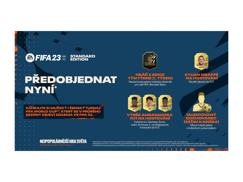 EA SPORTS™ FIFA 23 prináša do najpopulárnejšej hry sveta ešte viac akcie a futbalového realizmu. Vylepšená technológia HyperMotion2 s dvojnásobným počtom nasnímaných pohybov zo skutočného sveta pomáha vytvoriť skutočnejšie futbalové animácie než kedykoľvek predtým. Zahrajte si za ženské i mužské tímy s podporou dedikovaných animácií a využite možnosť hrania naprieč platformami, ktoré uľahčuje meranie síl s priateľmi.