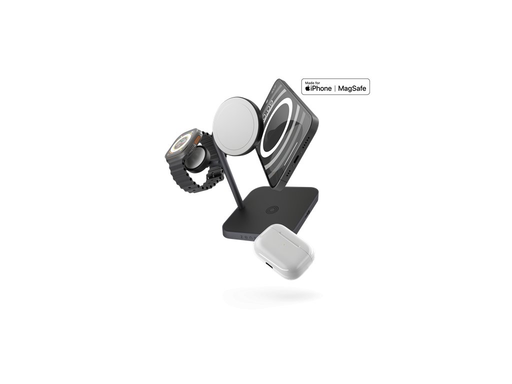 Bezdrôtová nabíjacia stanica MagSafe + Watch 4 v 1 je skvelým spoločníkom na nočnom stolíku, príručnom stolíku alebo na kancelárskom stole. Poskytuje úplný pokoj, pretože viete, že štyri vaše osobné zariadenia sa nabíjajú maximálnym výkonom. Táto nabíjacia stanica je vyrobená z vysokokvalitného zinku/zliatiny.